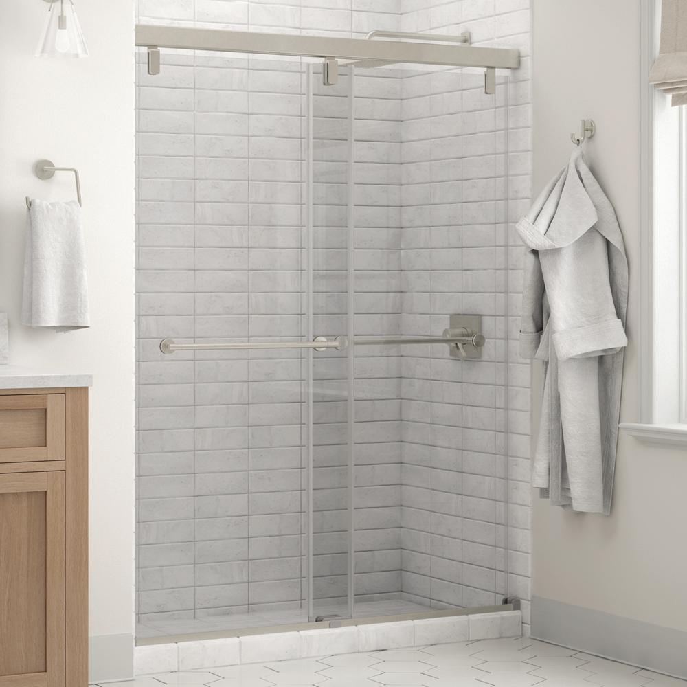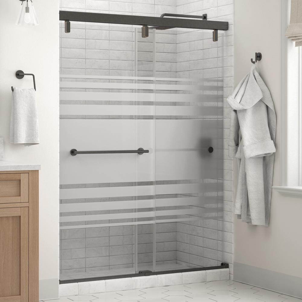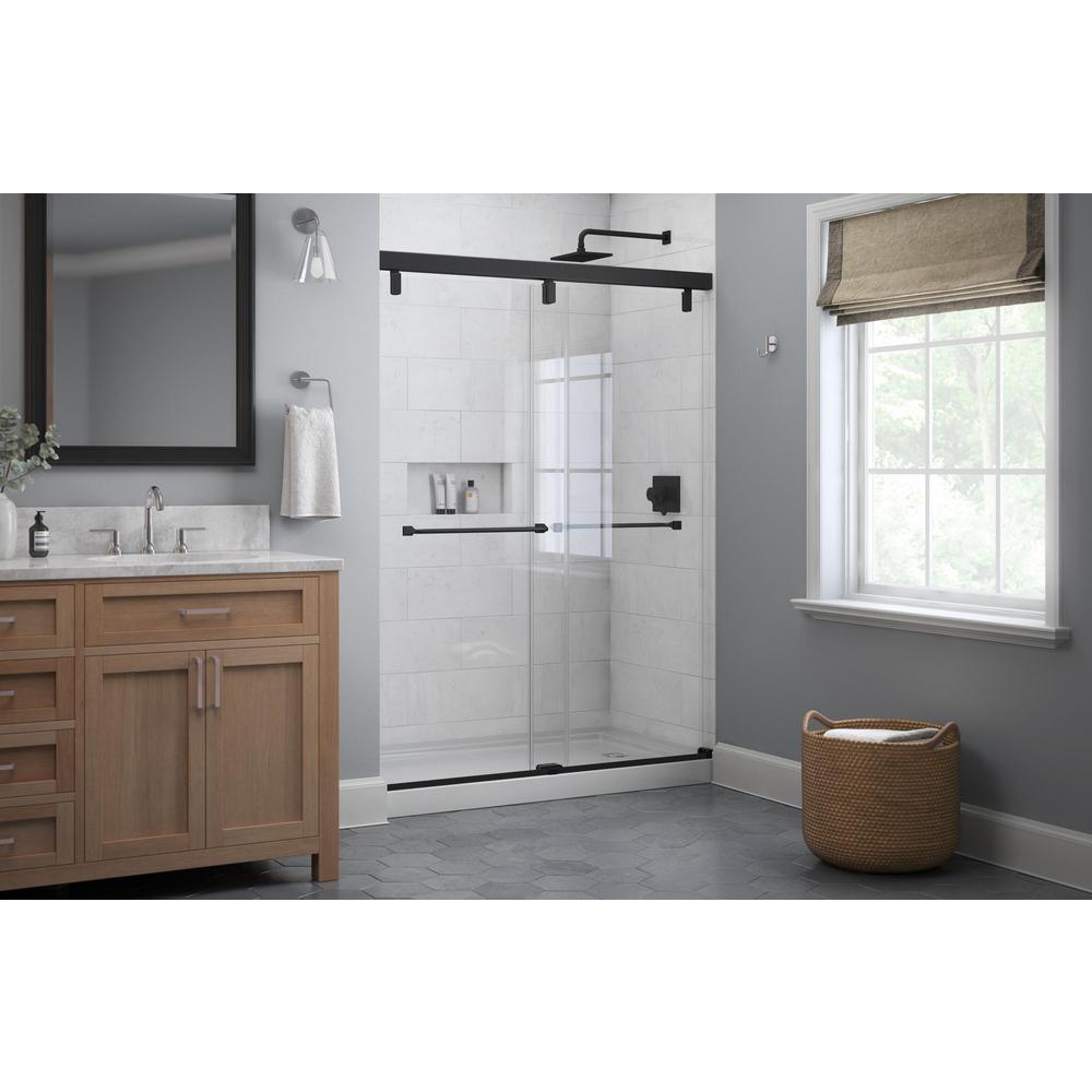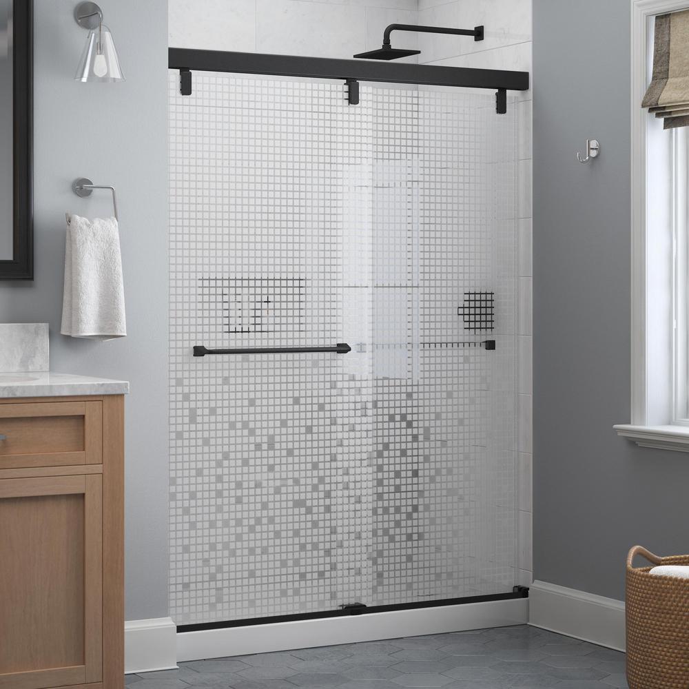 Whether you’re looking for a moderate DIY project or working on a bathroom remodel, upgrading your bathroom with a new sliding shower door is easy with the Delta 1-2-3 custom sliding shower door program. Delta’s custom glass shower door program offers 1000s of design combinations by choosing your glass shower panels, shower door track, and shower door handles to build a unique, personalized glass shower door. Clean, sleek and modern, the Mod shower door track in matte black features a soft close system paired with a reversible flat track, and minimal metal components, for the perfect balance of form and function. Show off your beautiful shower with standard 1/4 in. ANSI certified tempered glass shower panels, featuring Delta Spot Guard with a completely transparent look for a glass shower door that is both simple and elegant. The Everly sliding shower door handles in matte black feature two convenient towel bars for extra bathroom storage in a transitional design silhouette that beautifully combines contemporary and classic qualities.