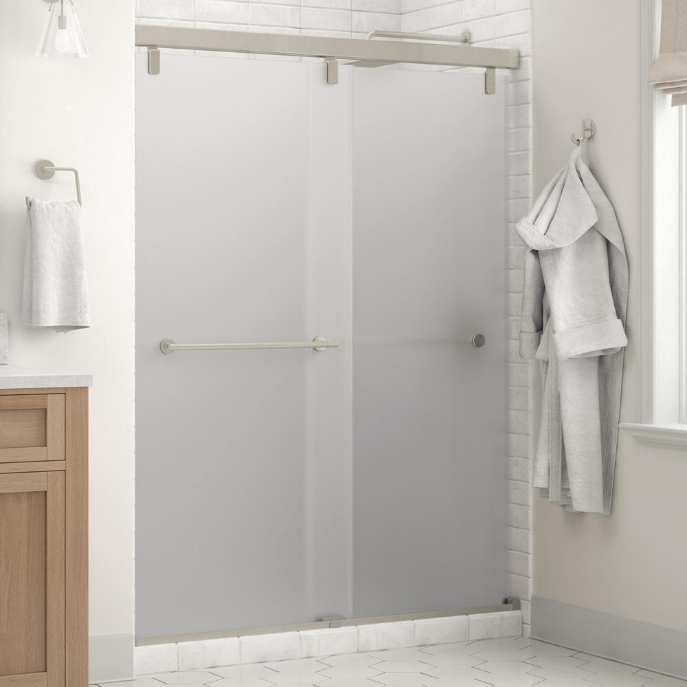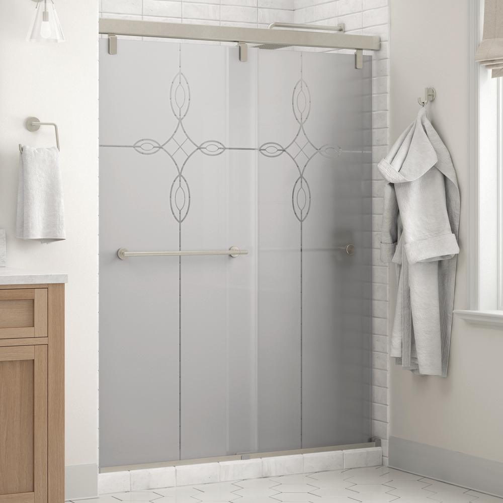 Delta sliding glass shower panels feature Delta Spot Guard glass treatment for easy cleaning, to resist water spots and hardwater stains, and help reduce soap scum and limescale buildup when properly maintained