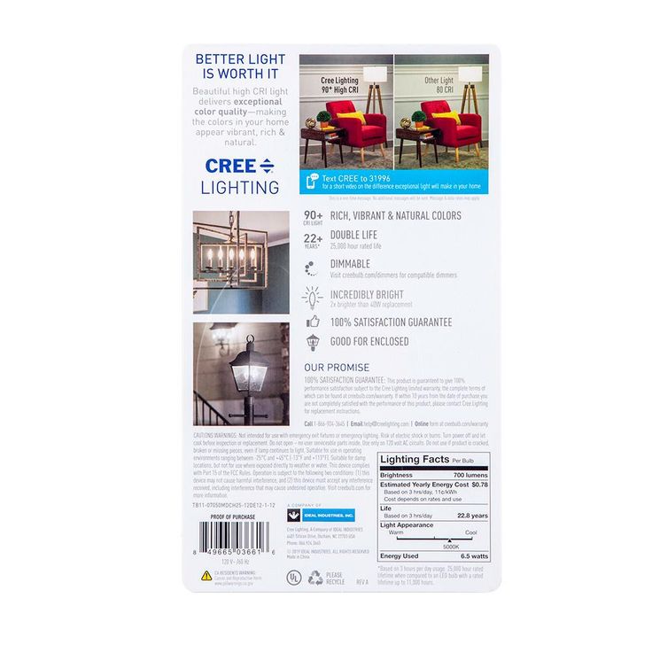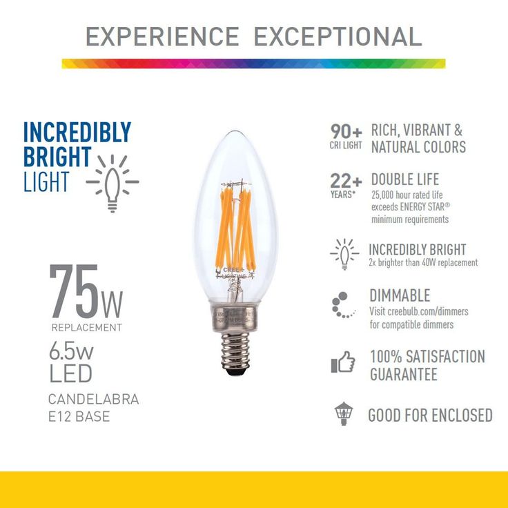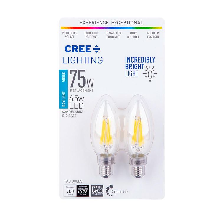 Cree 75-Watt Equivalent Candelabra LED bulbs are engineered to work better and last longer. Get the most light with over 700 Lumens of beautiful 90+ high CRI light - making the colors in your home appear vibrant, rich and natural. With a rated lifetime longer than many (25,000 hours 22+ years), Cree Candelabra LED bulbs are fully dimmable, good for use in fully enclosed fixtures and backed by a worry-free 10-Year 100% performance satisfaction guarantee. Because when a light bulb is designed to be in your home for decades, better is worth it.