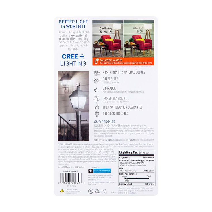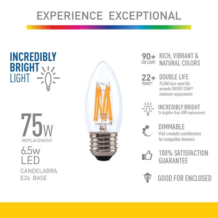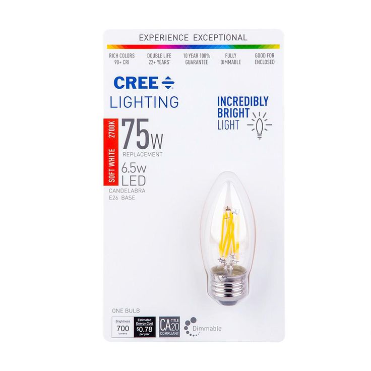 Ideal for use in outdoor post light fixtures and indoor decorative fixtures, Cree 75-Watt Equivalent Candelabra E26 LED bulbs are engineered to work better and last longer. Get the most light with over 700 Lumens of beautiful 90 plus high CRI light - making the colors in your home appear vibrant, rich and natural. With a rated lifetime longer than many (25,000-hours 22 plus years), Cree Candelabra LED bulbs are fully dimmable, good for use in fully enclosed fixtures and backed by a worry-free 10-Year 100% performance satisfaction guarantee. Because when a light bulb is designed to be in your home for decades, better is worth it.