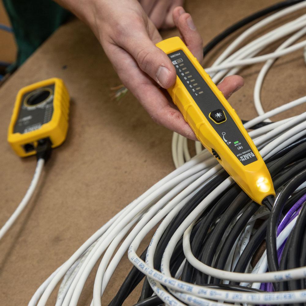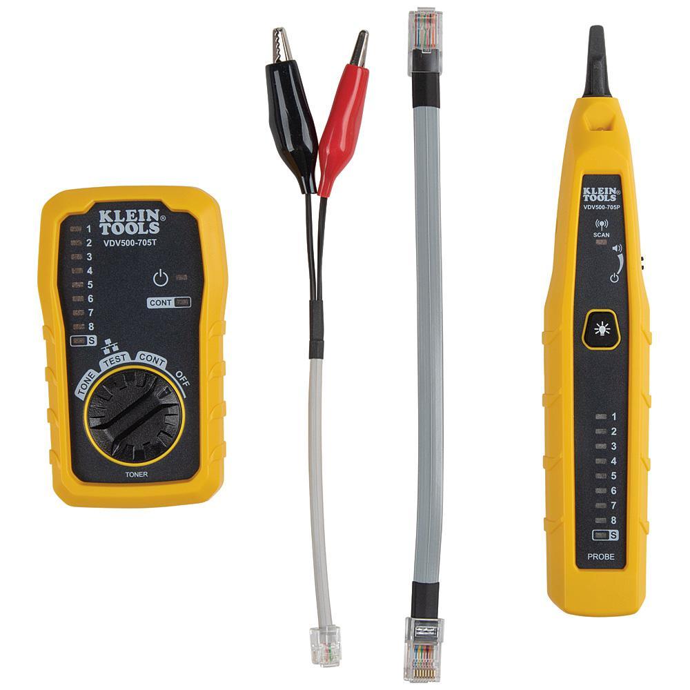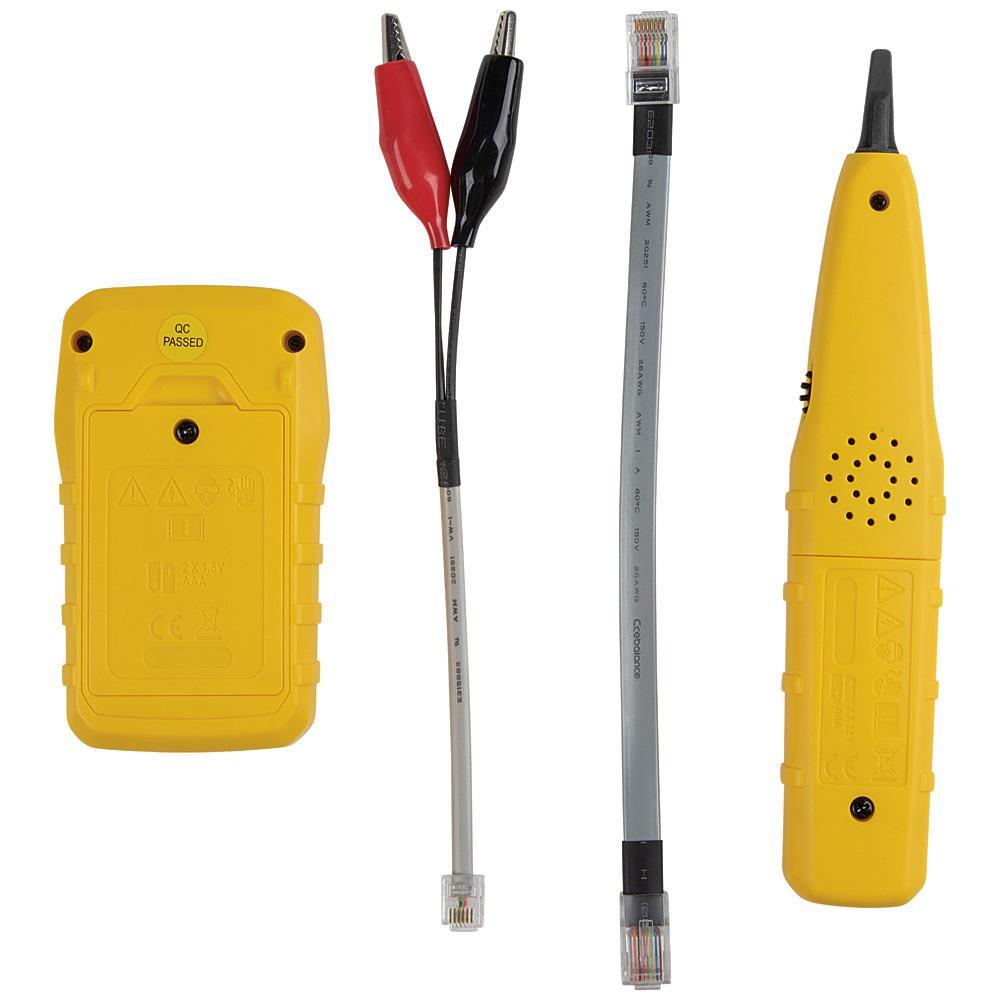 The Tone & Probe Test and Trace Kit provides simple toning and tracing of non-energized wire. The easy-to-use tone generator traces wire when used with the included probe. Alligator clips are provided for unterminated wires and an RJ45 to RJ45 cable to tone or test data cables. The responsive probe is a tone tracer with a durable, non-metallic, conductive tip, a speaker with audible output and headphone jacks for use in noisy environments (headphones not included). The worklight on the probe illuminates dark spaces. The toner and probe together perform pin to pin wire map test.