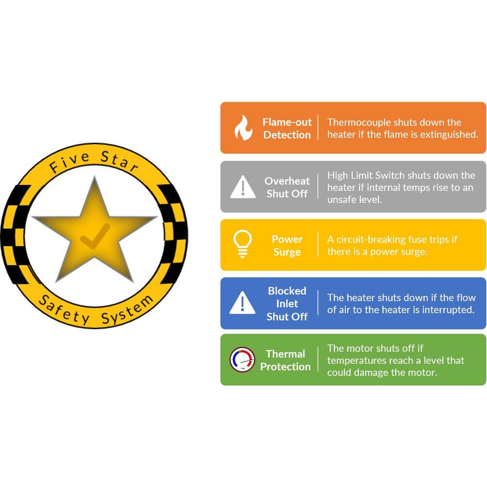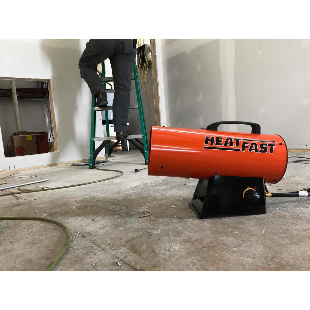 The HEATFAST HF160G 155,000 BTU Portable LP Forced-Air Propane Heater offers 3 heat settings and a maximum capacity of 155,000 BTUs, capable of heating up to 3,800 sq. ft. It is equipped with convenient electrical ignition and a dial control, making it ideal for various locations such as jobsites, garages, and workshops. In addition, it includes a built-in 5 star safety system with features like Flame Out Detection and Overheat Shut Off. CSA listed and easily transportable, this heater is perfect for adding extra warmth to any space.
