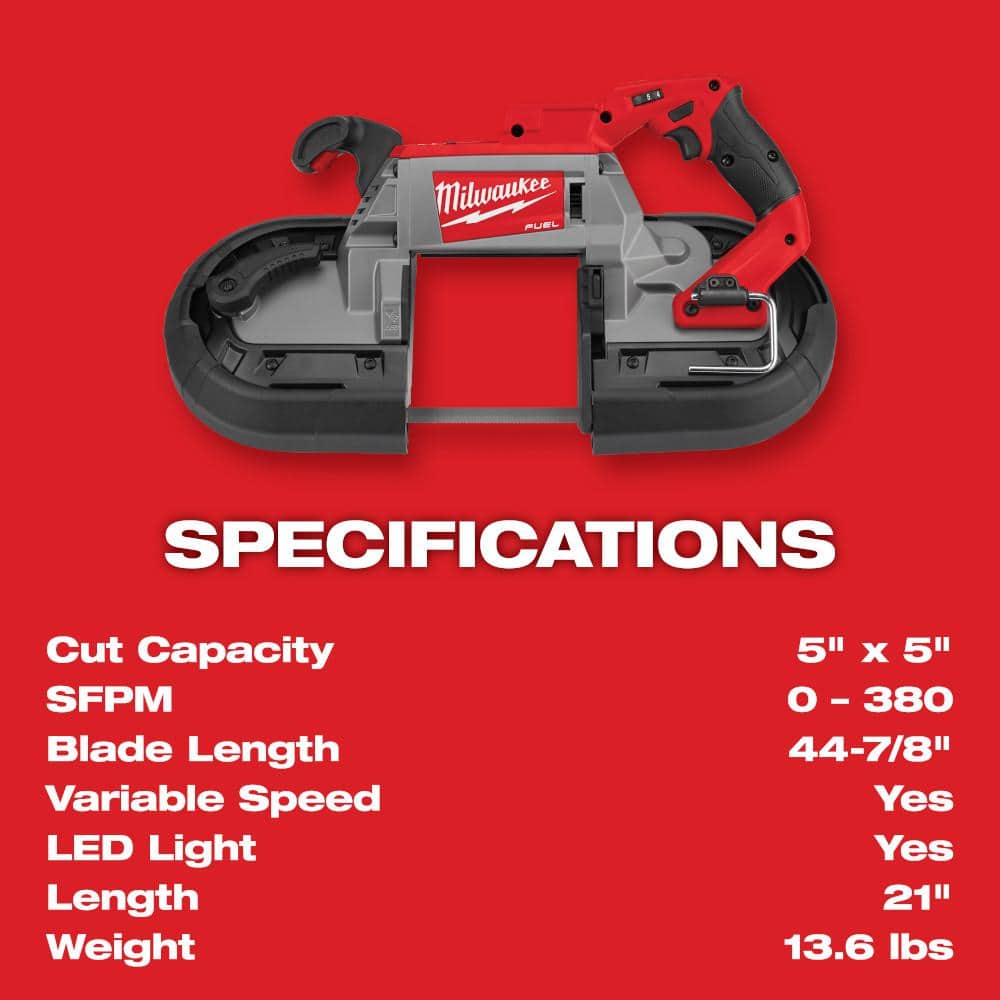 This Milwaukee M18 FUEL deep cut band saw delivers corded-speed performance with a POWERSTATE brushless motor and Constant Power Technology. The dual-trigger design ensures two-handed, safer cutting, while its 5 in. x 5 in. capacity, LED light, and tool-free adjustable shoe boost productivity on metal-cutting jobs.