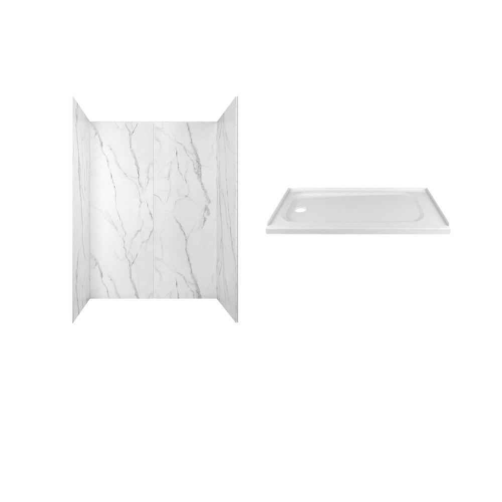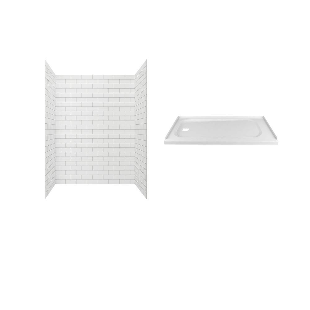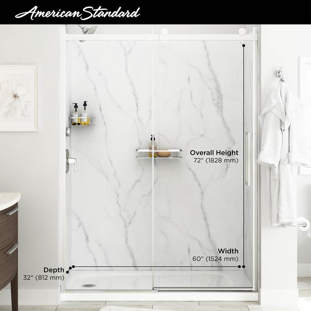 Shower walls include 2 side panels measuring 32 in. x 72 in. and a 2-piece back panel with finished nominal measurement of 60 in. x 72 in.
