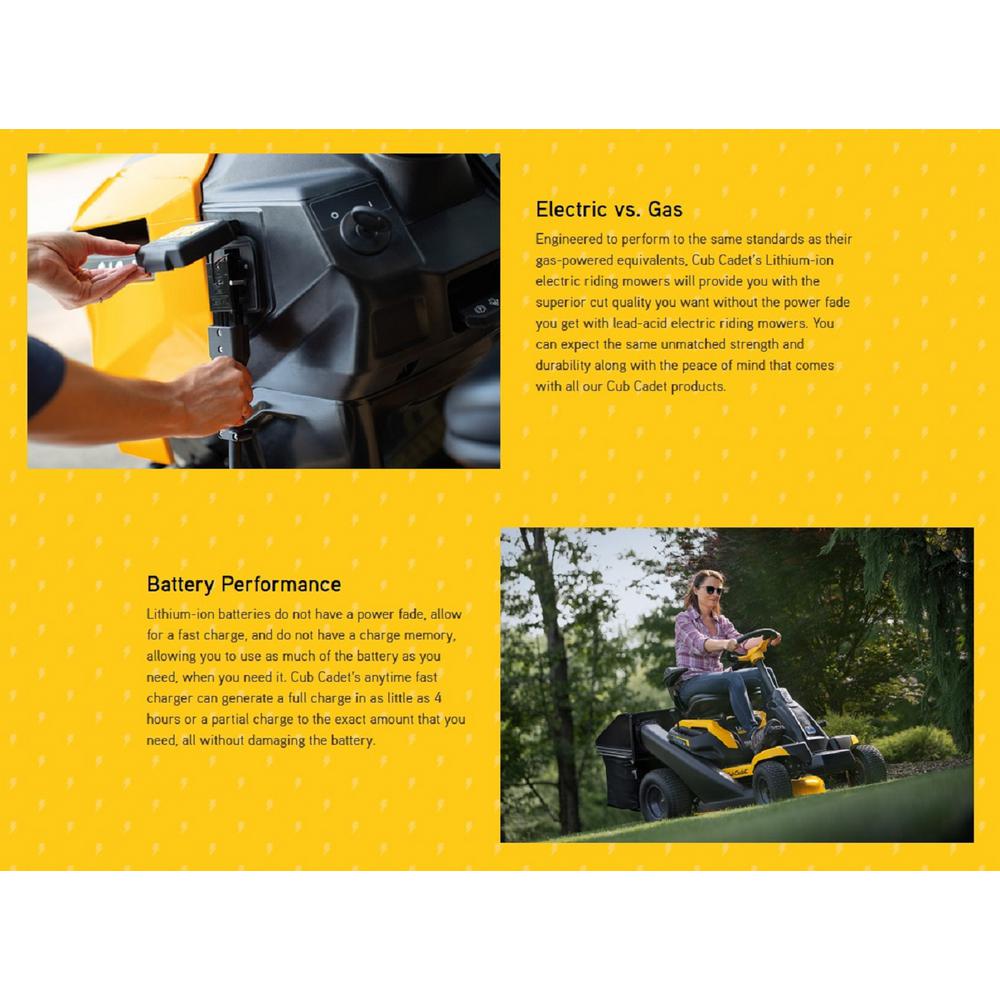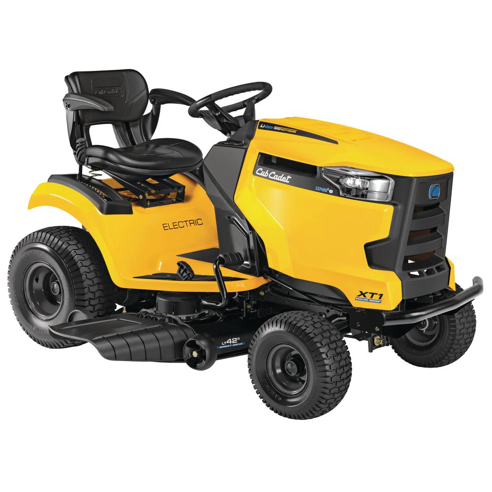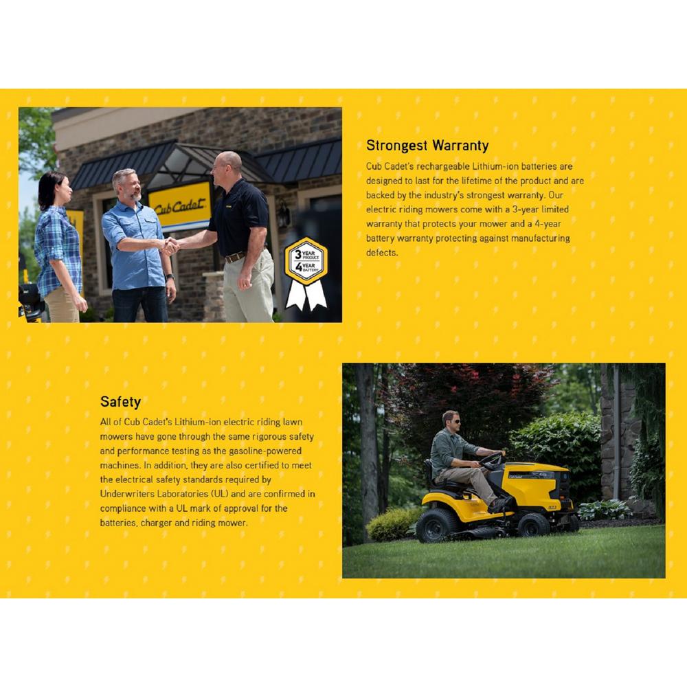This Cub Cadet electric riding lawn tractor is engineered to perform to the same high standards as it's gas counterpart while eliminating the need for gas and keeping maintenance to an all time low. You can expect the superior Cub Cadet signature cut every time with the 42 in. twin blade cutting deck that can power through up to 2-acres without any power drop off. And when it is time to recharge, you can expect a full recharge in approximately . 4-hours. We have minimized the maintenance due to this machine having no oil, clutch, throttle, belts, gears or the need for gas. This makes for a hassle-free, easy-to-use mowing experience that is all backed by an industry leading warranty, 3-year limited residential/4-year limited battery/5-year unlimited hours warranty on the chassis and front axle.