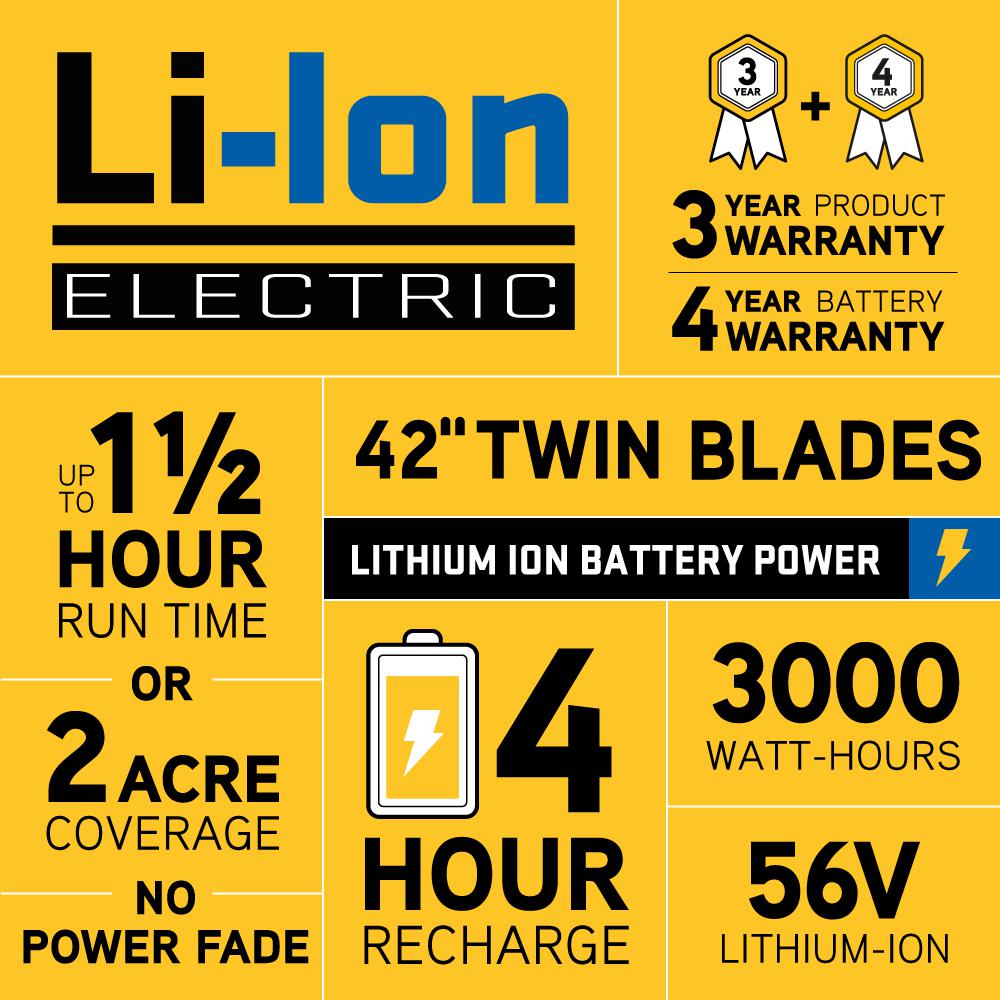 • 56-Volt, 60 Ah, 3000-Watt hour lithium-ion battery that can recharge off a standard 120-Volt outlet