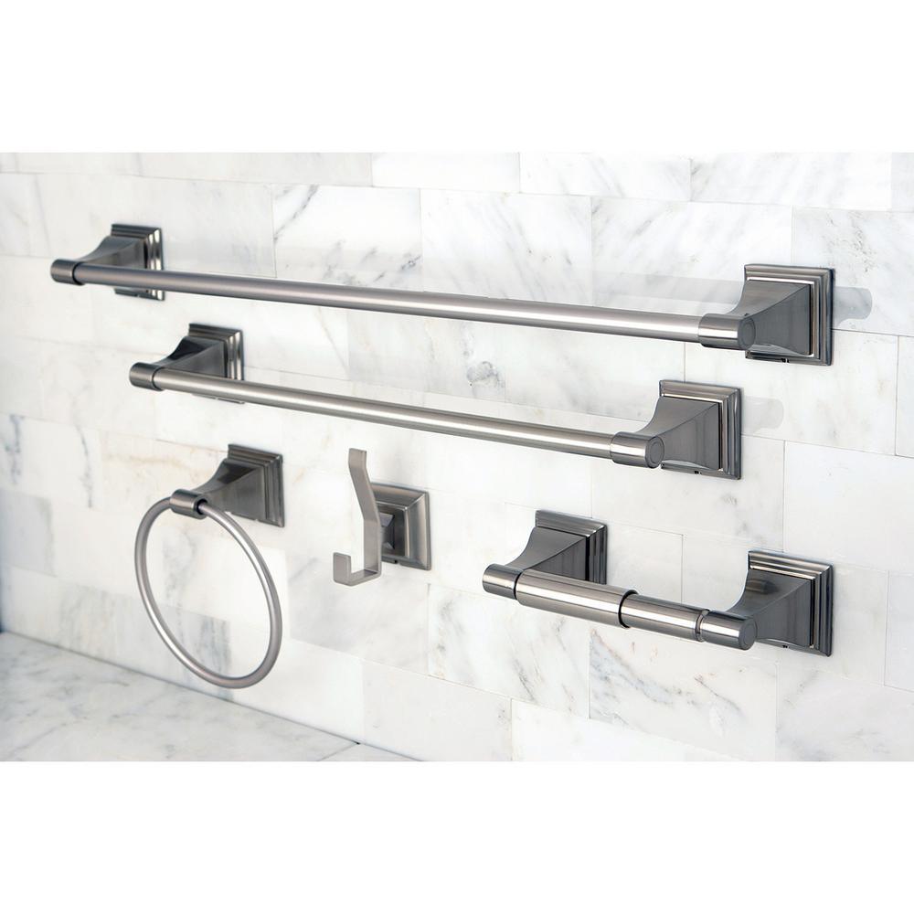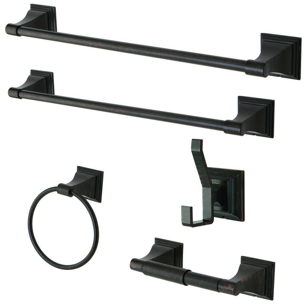 • Set includes 2-towel bars, towel ring, robe hook and toilet paper holder