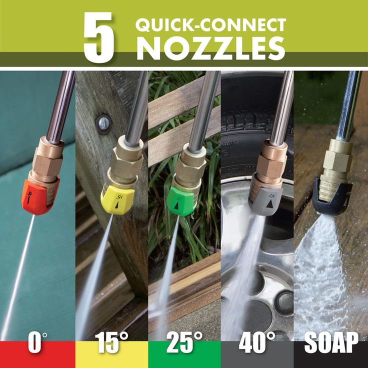 - 5 quick connect nozzles (0, 15, 25, 40 and soap) tackle different cleaning projects