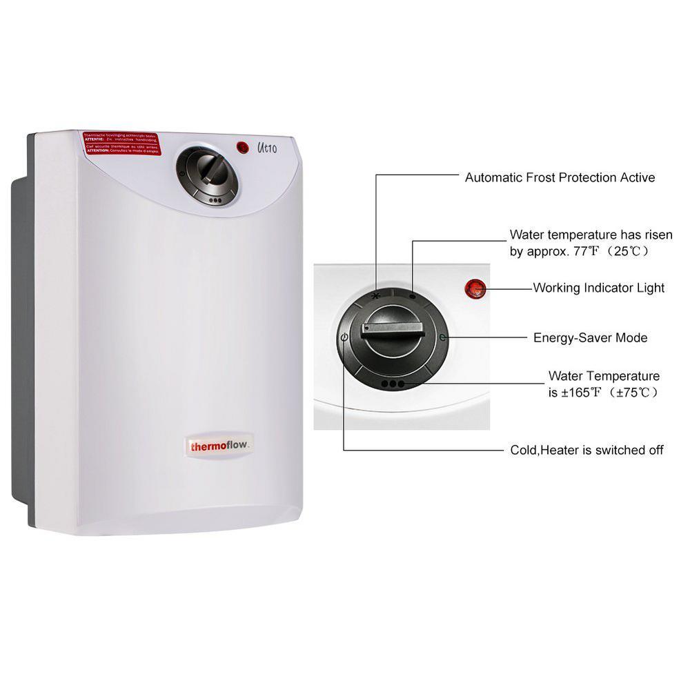 thermoflow UT10 electric mini tank water heater is a true Point of Use Model because it is specifically designed for under sink. In fact, the thermoflow can be used for three different applications: as a sole water heating source for a single sink, as a supplement to an existing heater located far from the sink, and as a buffer installed in-line with tankless water heaters that experience intermittent cold water, also known as 'cold water sandwiching'. No matter the configuration, there’s minimal stand-by loss from this premium mini-tank water heater.