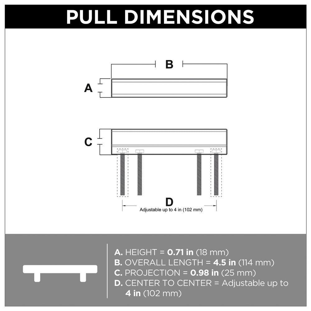 Flexible sizing allows this pull to fit a wide range of center-to-center mounting requirements up to 4 in.