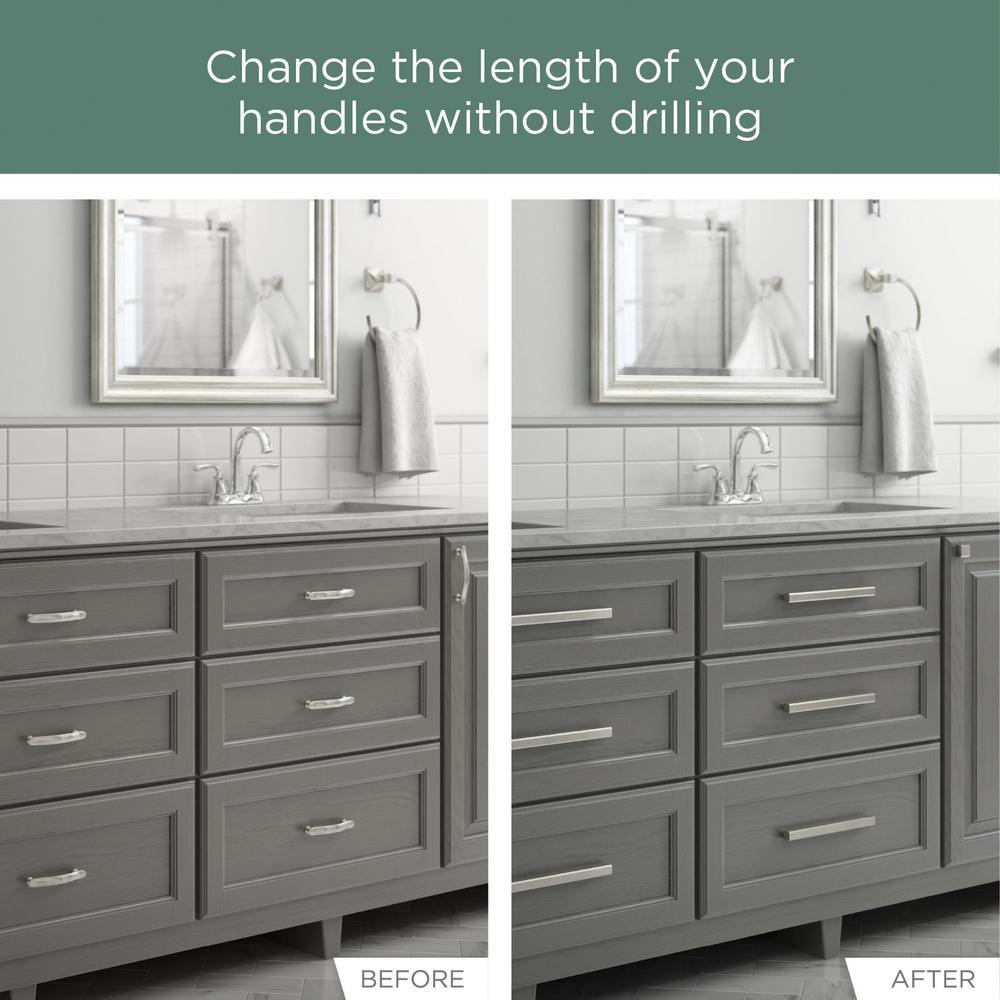 Developed with a special rear facing track, this handle glides along fasteners placed in cabinet drill holes to accommodate your size