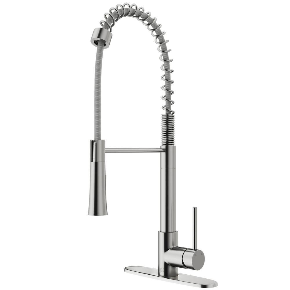 The VIGO Laurelton Pull-Down Spray Kitchen Faucet features a dual action, pull-down spray head and 360° swivel spout that is extendable up to 22 inches. These features, as well as the faucet's sleek lines and tall arch, bring modernity to any kitchen. Solid brass construction and corrosion resistant finish ensure durability. A matching deck plate allows for transformation from a 1,2,3, or 4-hole installation.