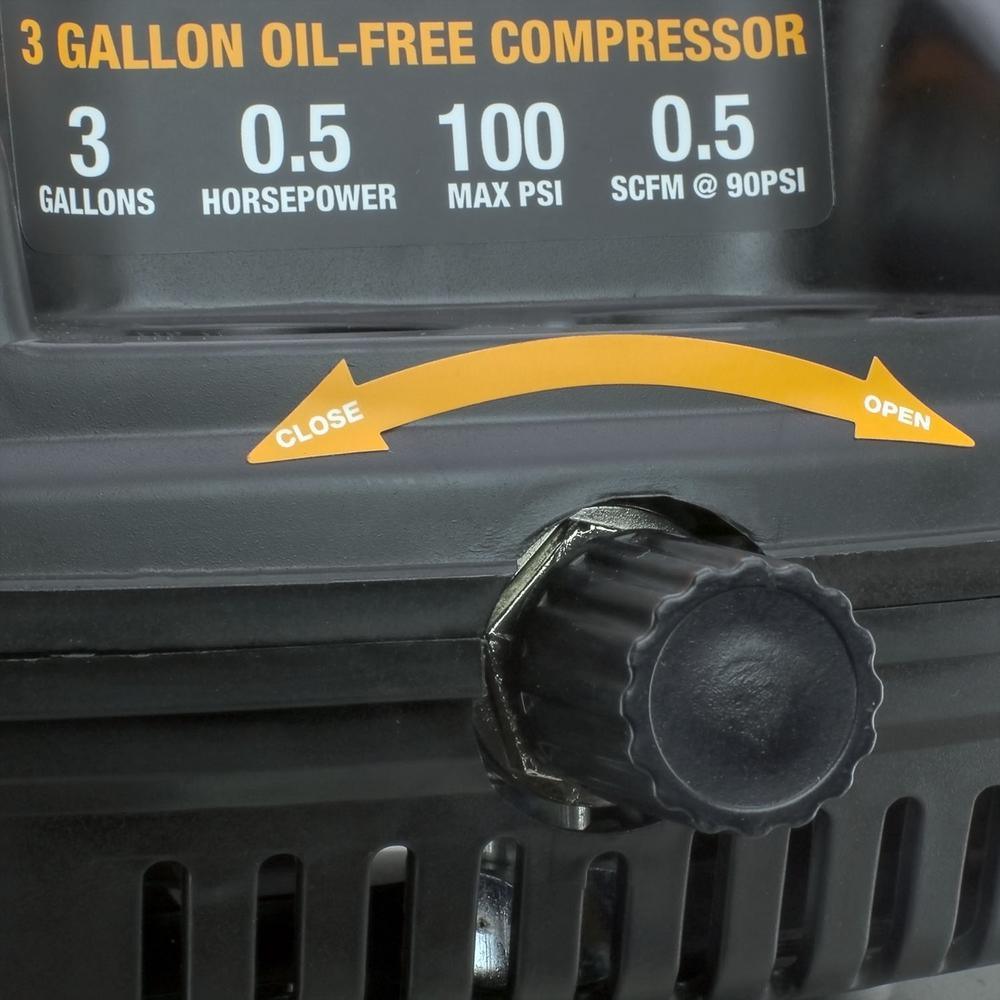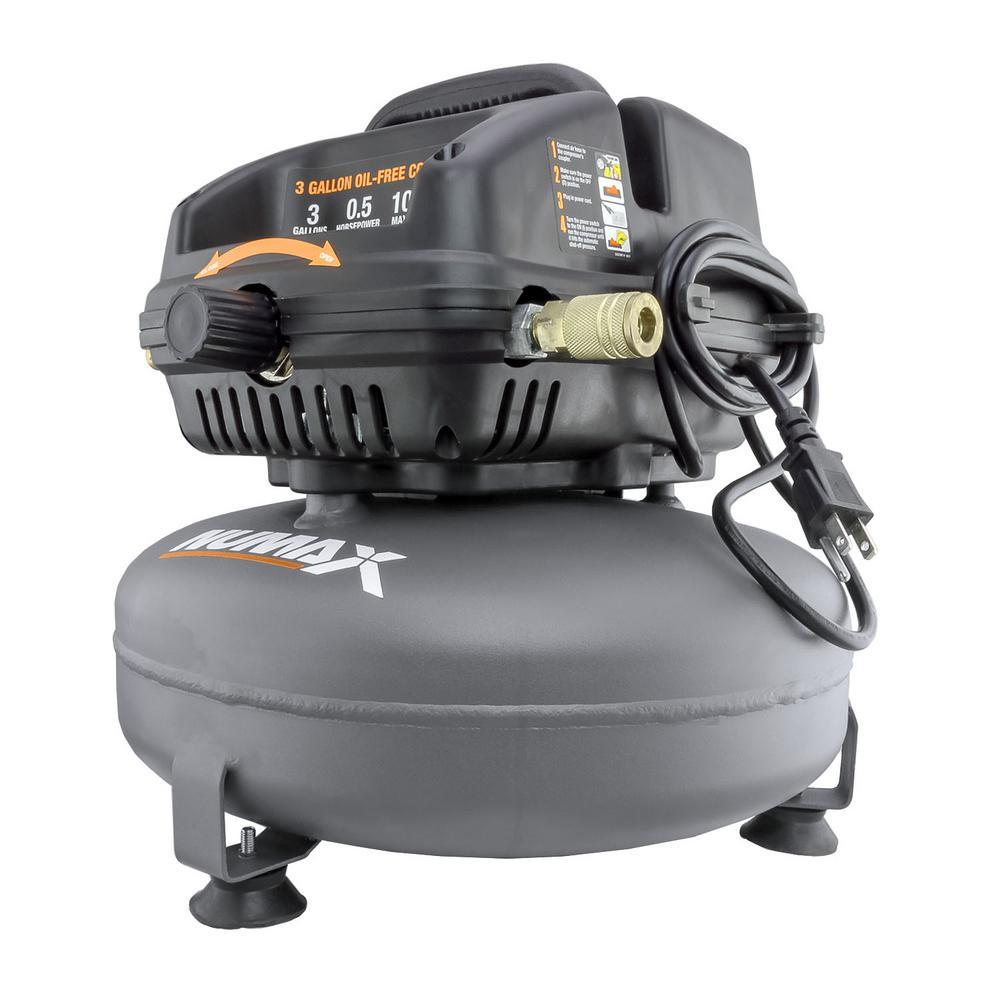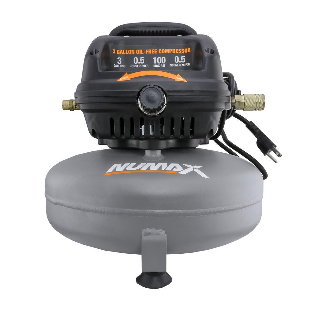 The NuMax S3GICK 3 Gal. 1/2 HP Portable Electric Oil-Free Pancake Air Compressor with 25 ft. Air Hose and 11-Piece Inflation Kit is ideal for supplying power to your pneumatic tools as well as handling all your inflation needs. The compressor contains an oil-free 1/2 HP electric motor for less maintenance, with thermal overload protection to safeguard against overheating and extend the life of the motor. The steel 3 Gal. pancake tank is compact and durable and does not require much space to get the job done. The 2-Gauge for tank pressure and output air pressure are easy to read and the convenient easy carry handle makes transporting the lightweight compressor a breeze. The drain valve and safety valve are durably constructed of brass to resist rust and corrosion and a universal quick connect coupler makes it fast and easy to hook up your air powered tools. 3 no mar anti-vibration rubberized feet on the compressor prevent it from moving around, provide excellent stability and make it safe to use even on finished flooring surfaces. This 3 Gal. 1/2 HP Portable Electric Oil-Free Pancake Air Compressor Kit includes a 25 ft. air hose and an 11-piece inflation kit and is covered by NuMax's 1-year Limited Warranty.