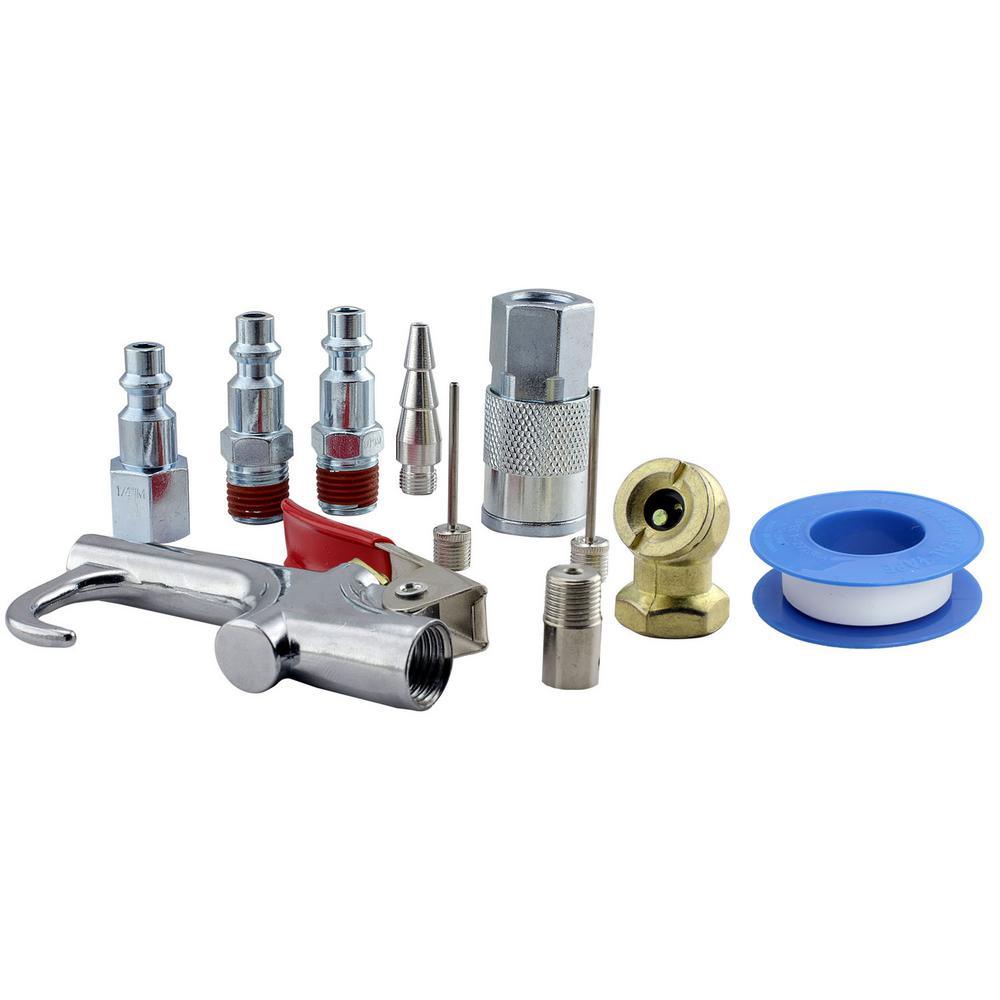 Includes 25 ft. air hose with bend restrictors and brass 1/4 in. NPT fittings and 11-piece inflation kit with a blow gun, 2 inflation needles, a tapered inflator nozzle, a 1/4 in. NPT female coupler, 2-1/4 in. NPT male plugs, an inflation ball chuck made of brass, a 1/4 in. NPT female plug, an air inflation adapter and Teflon tape