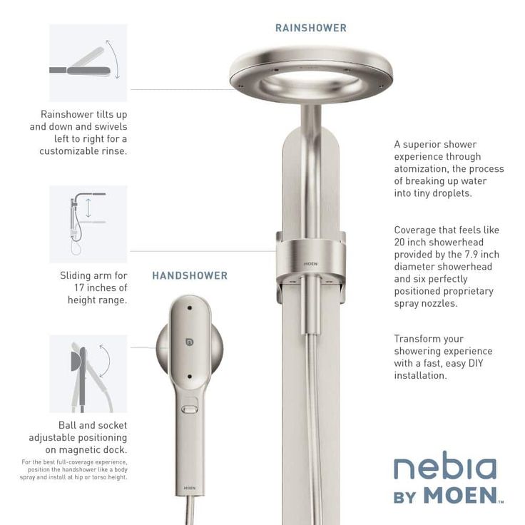 Nebia by MOEN is a spa shower that uses a unique water delivery system to provide more pressure wand double the water coverage of traditional showers, creating a blissful showering experience. Meticulously engineered for optimal warmth, rinsing and body coverage, Nebia by MOEN™ offers a superior shower experience through atomization, the process of breaking up water into tiny droplets. Nebia by MOEN’s patented spray technology creates the sensation of more water, while actually using 45% less. This means each water drop works harder to get you clean, refreshed and ready to take on the day.