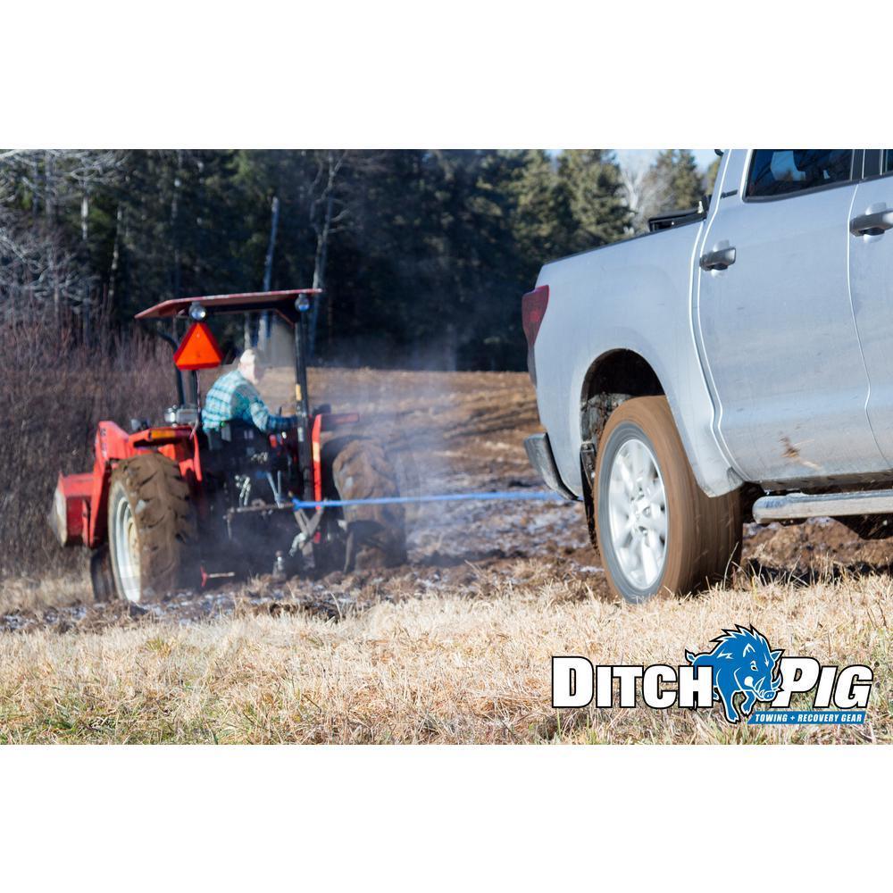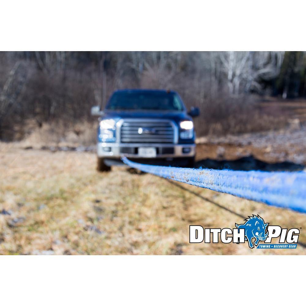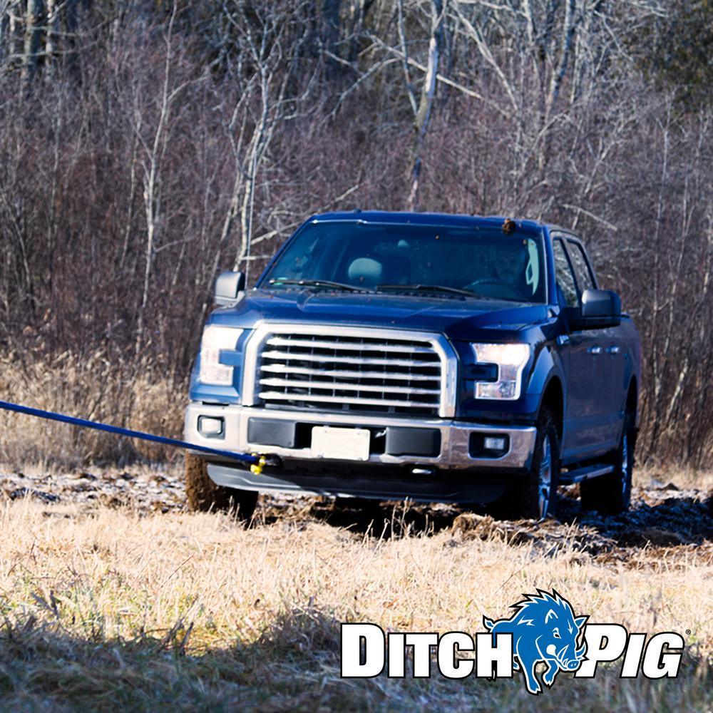 DitchPig Kinetic Energy Recovery Ropes are the safest and easiest way to get a vehicle unstuck from mud, sand or snow. Used for dynamic vehicle recoveries when your vehicle is working, but you simply cant get unstuck. Recovery Rope is made from 100% high-tenacity double braid Nylon rope, which naturally stretches up to 30% of its original length. As the rope stretches, it builds up kinetic energy, like a rubber band. Once the rope reaches maximum stretch, it starts to return to its original length. It literally works like a slingshot. Its simple and brilliant. Kinetic Energy Recovery Ropes are the safest and easiest vehicle recovery tool - perfect for recreational off-roading, everyday cars, construction and commercial vehicles and farming machinery. 7/8 in. size has a Minimum Breaking Strength (MBS) of 24,700 lbs., making it ideal for Large SUV's, 4x4s, Mid-Size Pickup Trucks and Medium Utility Tractors. The pulling vehicle always needs to be on stable ground, so the 30 ft. L is great if you're using the rope in a large mud patch or bog. Comes with a mesh tote bag. Because water reduces Nylons strength by up to 15%, keep your DitchPig rope clean and dry when not in use. The mesh netting allows your wet recovery rope to drain and dry quickly, bringing the rope back to full strength. DitchPig Don't Get Stuck Without It.