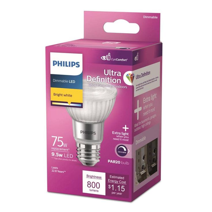 Philips LED PAR20 dimmable indoor/outdoor light bulbs are a smart alternative to standard halogen, featuring a longer life and excellent dimming performance. This Philips 8.5-Watt PAR20 LED flood light is the perfect replacement for anywhere flood lights are used, such as recessed cans or track light fixtures. Fully dimmable, this bulb provides a bright white light, perfect for use in kitchens, living rooms and dining rooms and it can replace your current 75-Watt PAR20, saving you in energy costs.