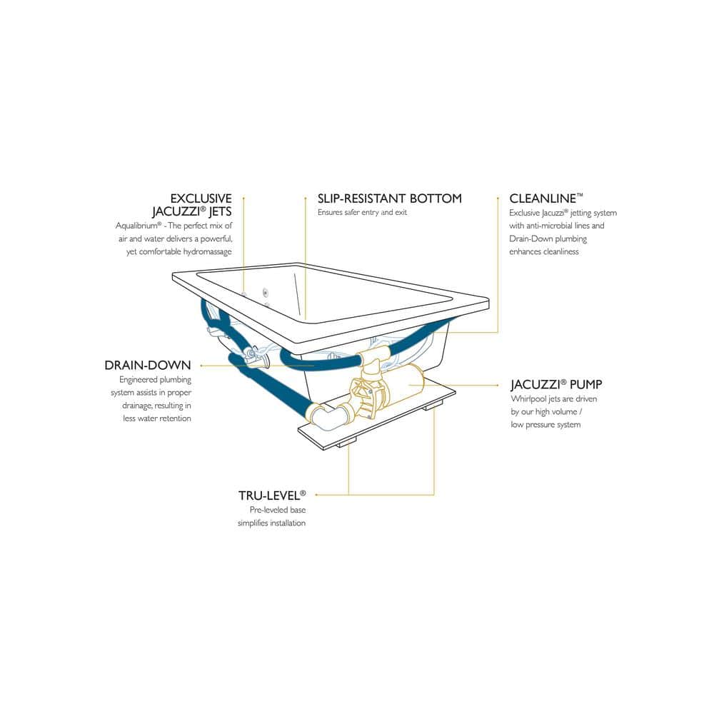 A classic rectangular drop-in whirlpool tub engineered by Jacuzzi for targeted hydrotherapy and everyday comfort. Durable high-gloss acrylic with ergonomic armrests and slip-resistant bottom, powered by 8 adjustable jets for a personalized massage. Designed for right-hand drain installations with a pre-leveled base for simpler setup.