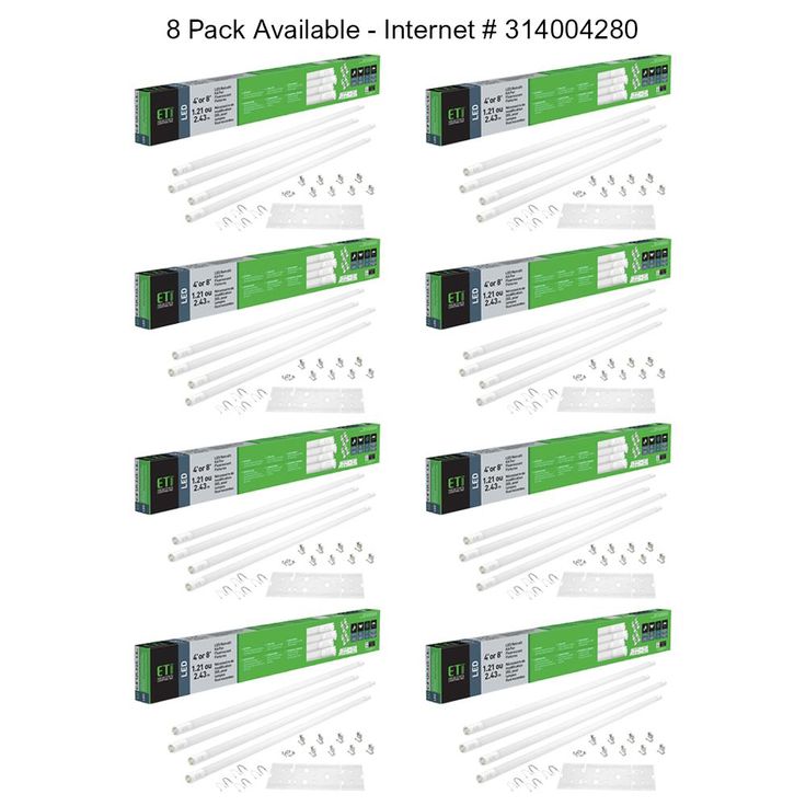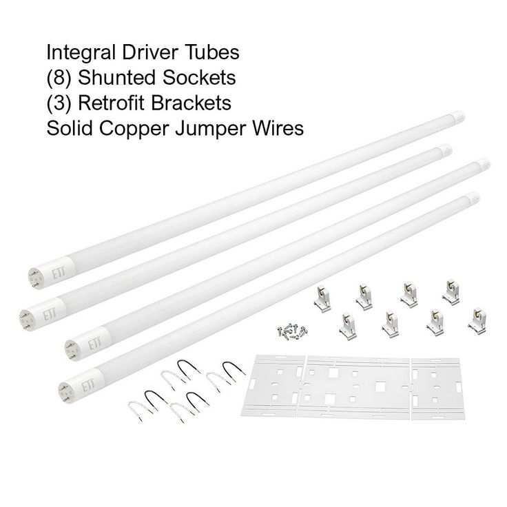 ETi's 8 ft. to 4 ft. Retrofit Conversion Kit for Fluorescent lights is designed to upgrade an 8 ft. fluorescent strip light into two tandem LED 4 ft. lamps or continuous 8 ft. This kit includes: (4) 4 ft. LED Power Either End Base G13 Bi-Pin Bypass Ballast tubes, (8) Shunted sockets, (3) Retrofit Brackets and Solid Copper wires. With these tubes, existing sockets in the fixture can continue to be used if they are in good condition. Each tubes emits crystal clear 1800 Lumens of brightness; total 7200 Lumens, using 12-Watts of power; total 48-Watts. Each 12-Watt tube replaces one 32-Watt T8 fluorescent. Light output is 5000K Daylight and is non dimmable. Ideal for kitchen, basement, retail shops, shop windows, retail offices, doctor offices, schools, restaurants, museums, galleries, meeting rooms and hotel/motel locations.