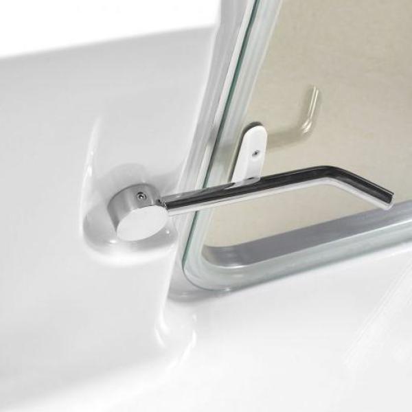 Safer Entry Design: Low step-in threshold, textured floor, and centered inward-swing tempered glass door reduce slip and trip risks.