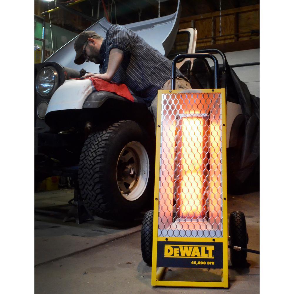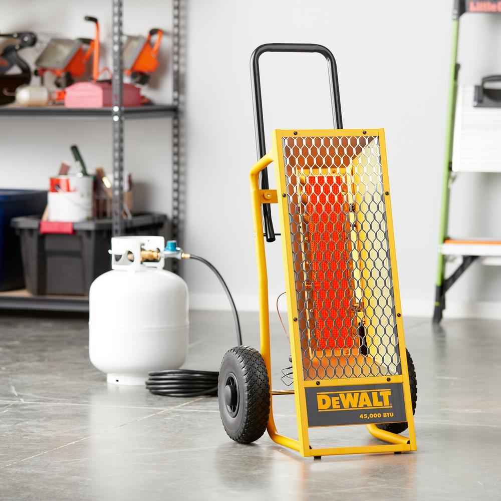 The DXH45LP portable propane radiant heater burns at 45,000 BTU/HR and requires no electricity to operate. Equipped with top of the line roll cage style construction to make it one of the most durable jobsite heaters available. With high density polyurethane wheels you never have to worry about flat tires. Includes a 20 ft. hose and regulator assembly. Heats approximately 1125 sq. ft. of space. When using a 20 lbs. propane tank you can expect to get around 10-hours of use.