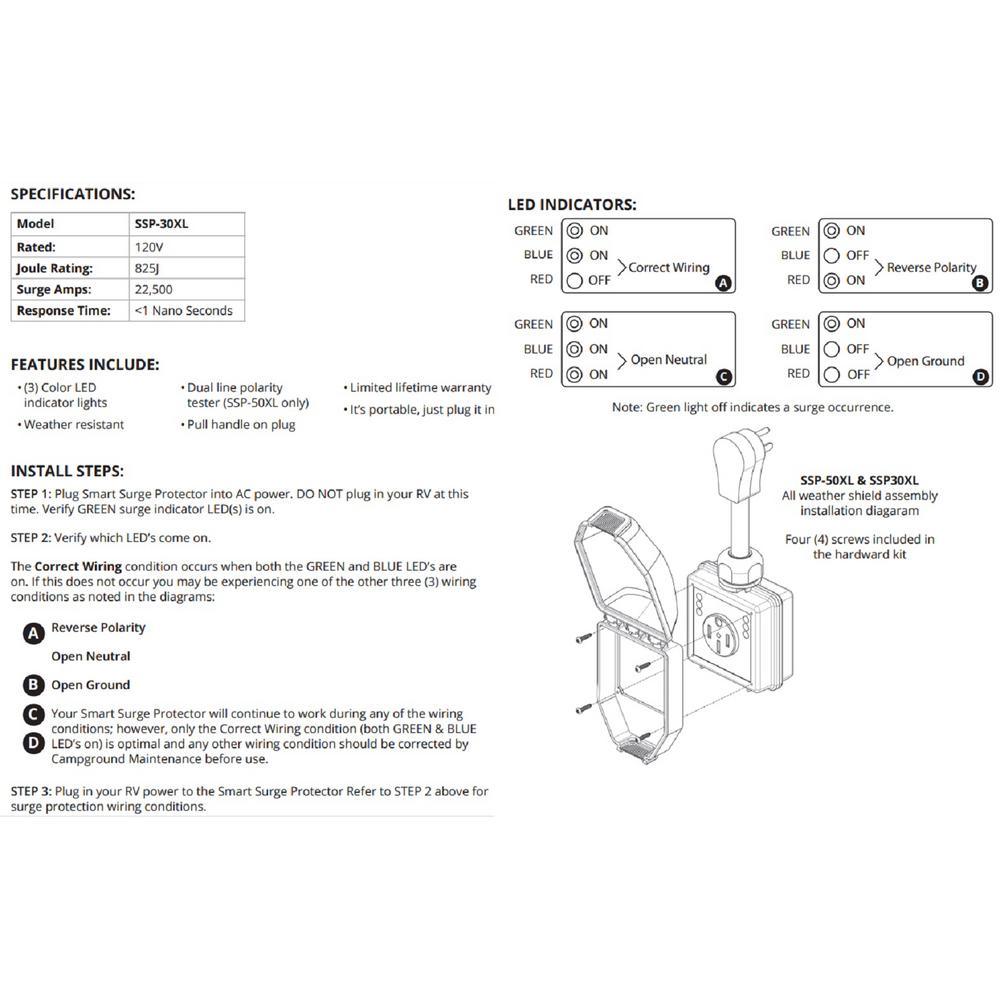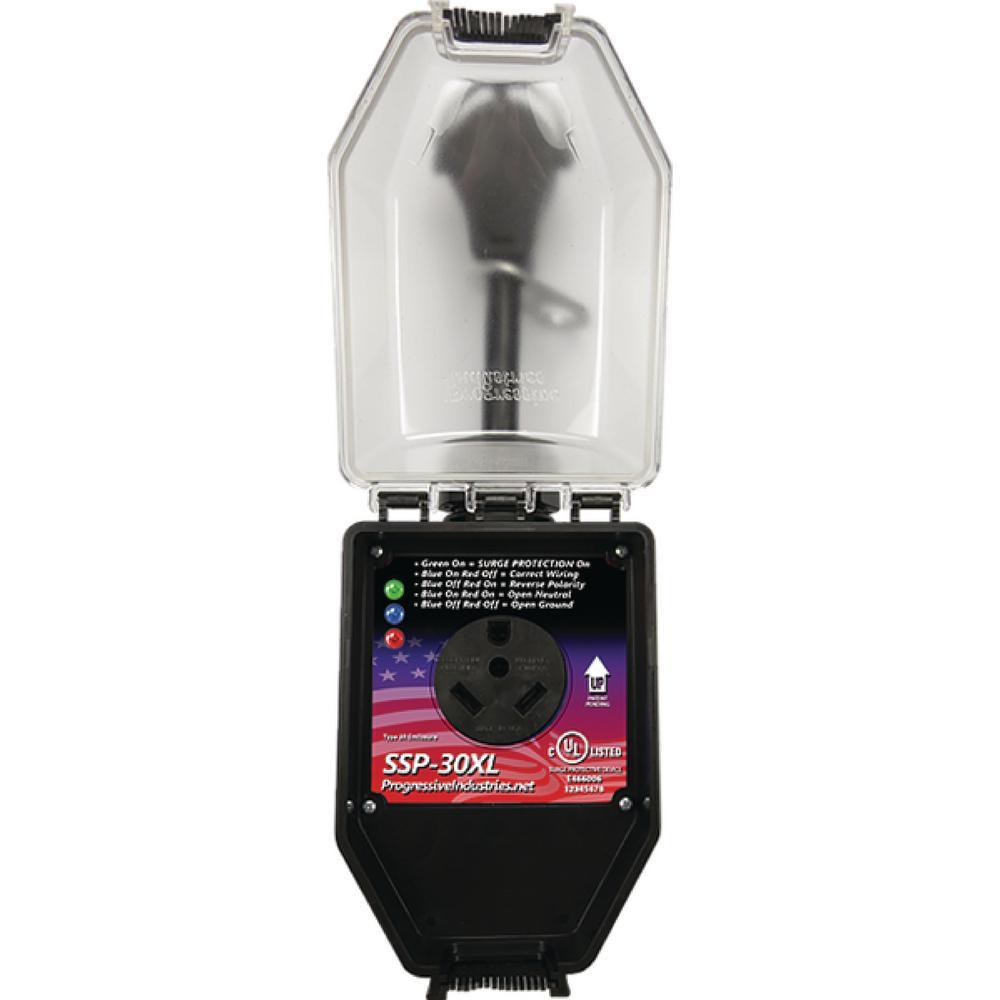 Regular price $92.92Built-in polarity tester. The built-in surge indicator notes the condition of the surge protector. Additionally, the polarity tester (dual line for 50 Amp) checks the status of the power source prior to use. Units are sleek, compact and the portable design makes them easy to use and store. Designed for outdoor use. Open Ground, Open Neutral and Reverse Polarity Detection. Mis-wired pedestal indication. Surge failure indicator. Thermally protected. Brighter 3-color LED indicators. Rugged pull handle. Weather resistant/outdoor use. No installation required. UL Listed and CSA Approved. Progressive Industries Smart Surge Protectors (SSP) are portable RV surge protectors with the added benefit of a built-in polarity tester. The built-in surge indicator notes the condition of the surge protector. Additionally, the polarity tester checks the status of the power source prior to use. Sleek, compact, portable design makes this unit easy to use and store. All weather shield provides additional protection while the unit is plugged in. Plug-and-play application, no installation required. Designed for recreational vehicle use only. Product Specs: Surge Protection: 3-Mode/825J/22,500A max current spike. Product Dimensions with All Weather Shield Assembly Cover: 5 in. W x 13-1/2 in. H x 5 in. D. Box Dimensions: 5-1/4 in. W x 14-1/4 in. H x 3-1/2 in. D. Boxed Weight: 3 lbs. Response time: less than 1 nanosecond (10-9 second). Operating Temperatures: -40C to +105C. Ratings: 30 A/120-V/3,600-W.