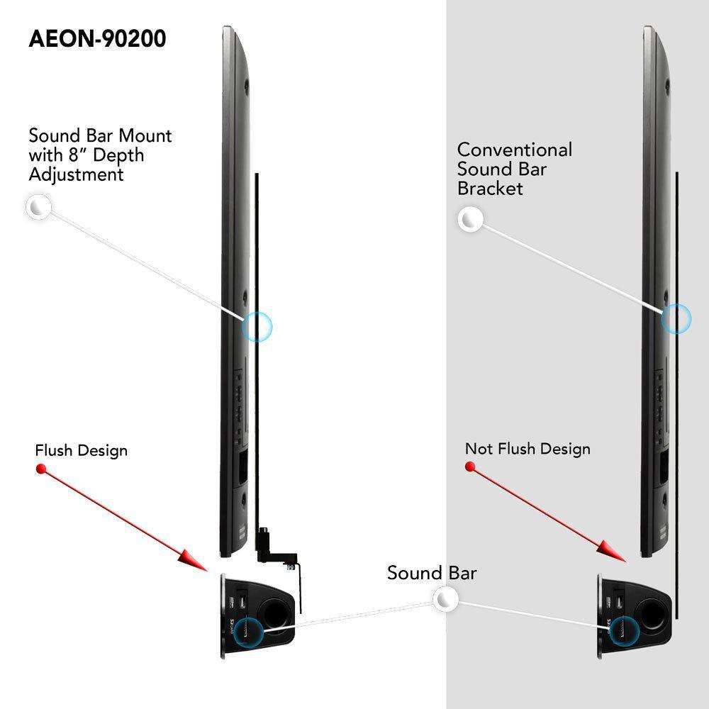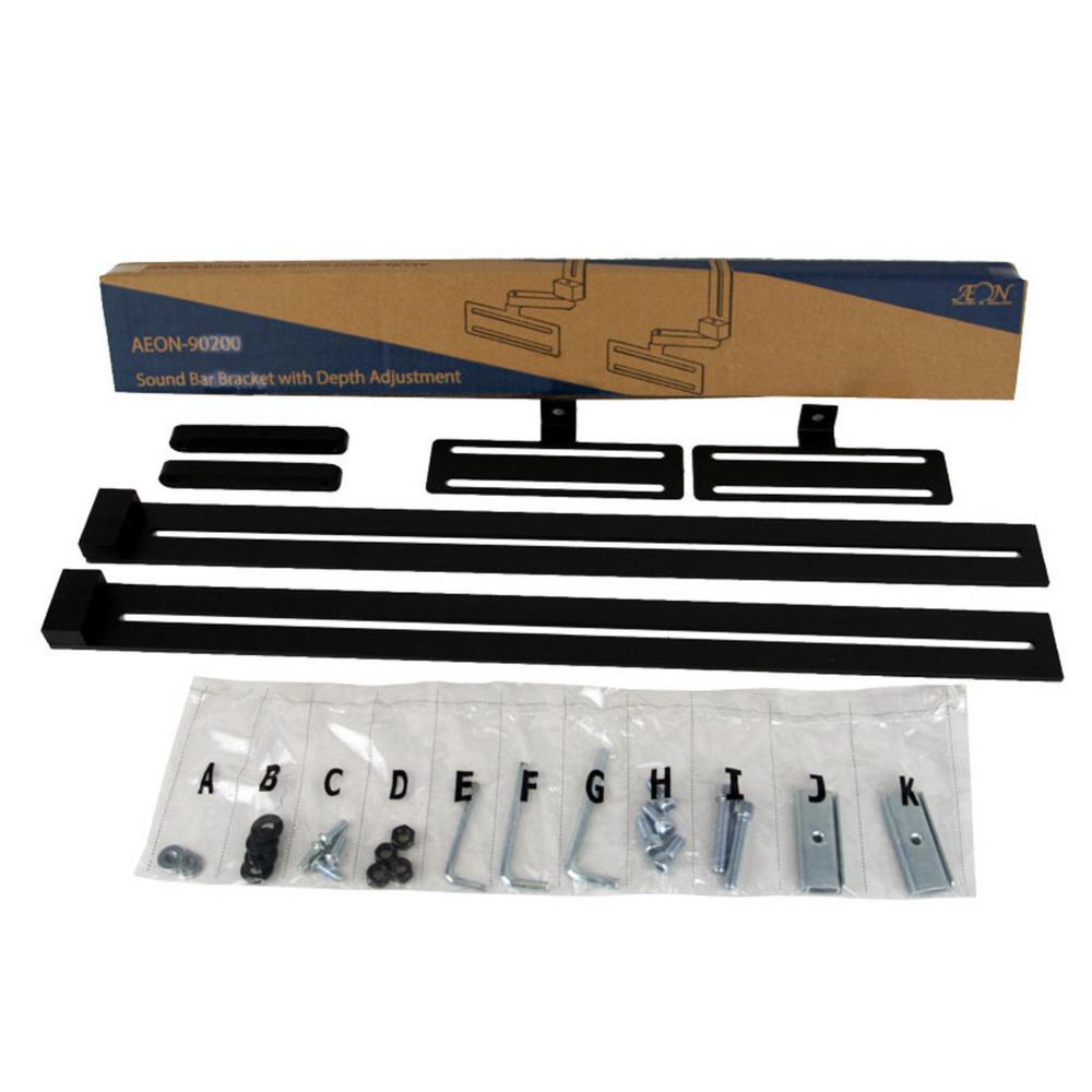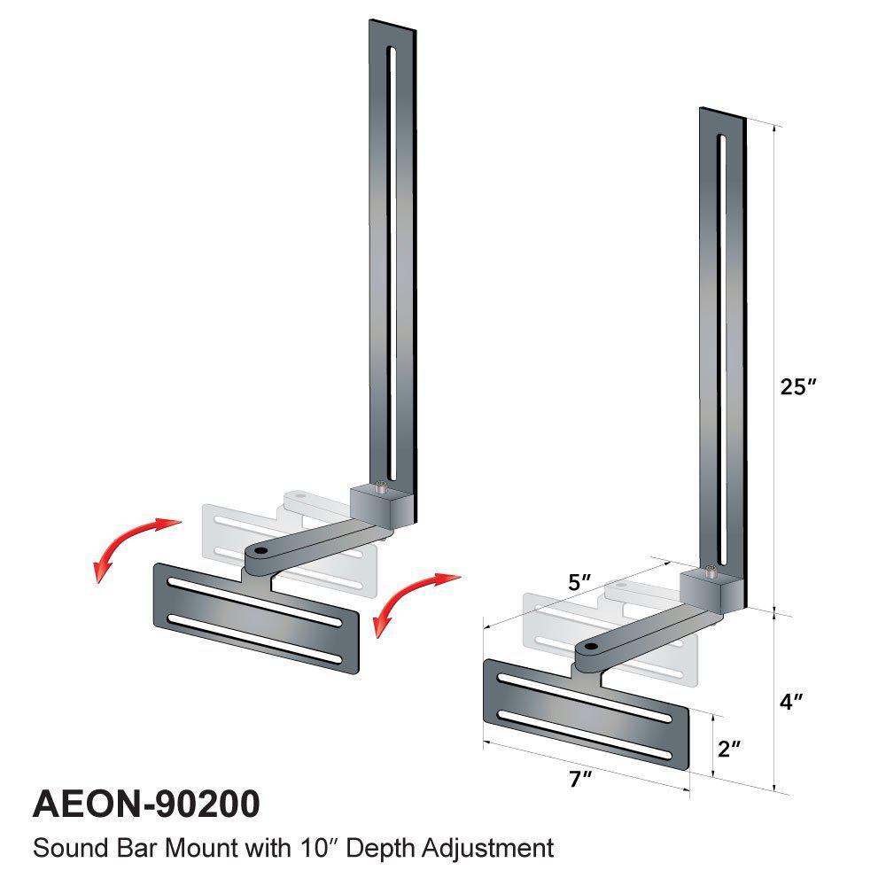 One of a kind With most Soundbar brackets on the market, the Soundbar will stick out too far in front of the TV or too far behind it. They often hang too low as well. With the Aeon 90200 Soundbar Bracket having a depth and height adjustment, you are able to get the thickest of Soundbars or even the thinnest, perfectly even (flush) with the front edge of the TV. This makes for a much more seamless and sleek look. best seat in the house when you pivot or swivel your TV on its wall mount, the soundbar pivots and swivels with it. The sound follows the TV. Now wherever you sit you get the best view and the best sound designed to work with aeon and other tv wall mounts This Soundbar bracket is easy to install and is designed to work with any tv mount but specifically designed to match with Aeon TV wall mounts. With these AEON mounts the soundbar will install directly to the rails instead of between the TV giving you more flexibility. With other mounts simply install the rails of the soundbar mount between the TV and your TV Mount. It is compatible with virtually every TV wall mount and many TV stands as well. works with nearly every soundbar Compatible with virtually and Soundbar that has mounting holes on the back. Even the Sonos soundbar which has keyholes. Adjusts for depth, height and width of Soundbar. The two slotted mounting brackets and swivel base insure you can align the holes on your soundbar with this soundbar bracket for a perfect fit every time.