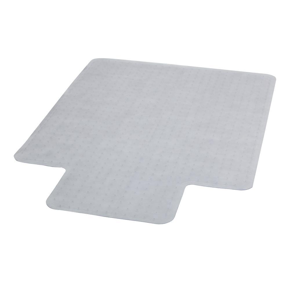 Move around easily in your carpeted workspace with this clear vinyl, commercial grade chair mat that will prevent carpet wear caused by chair casters. It features a scuff and slip resistant top surface for durability and safety. The underside has a gripper back to firmly anchor the chair mat on low pile carpet, protecting your carpet from spills and damage. The mat includes a protruding lip to protect the carpet under the desk and allow the chair to roll even when it's all the way under the desk.
