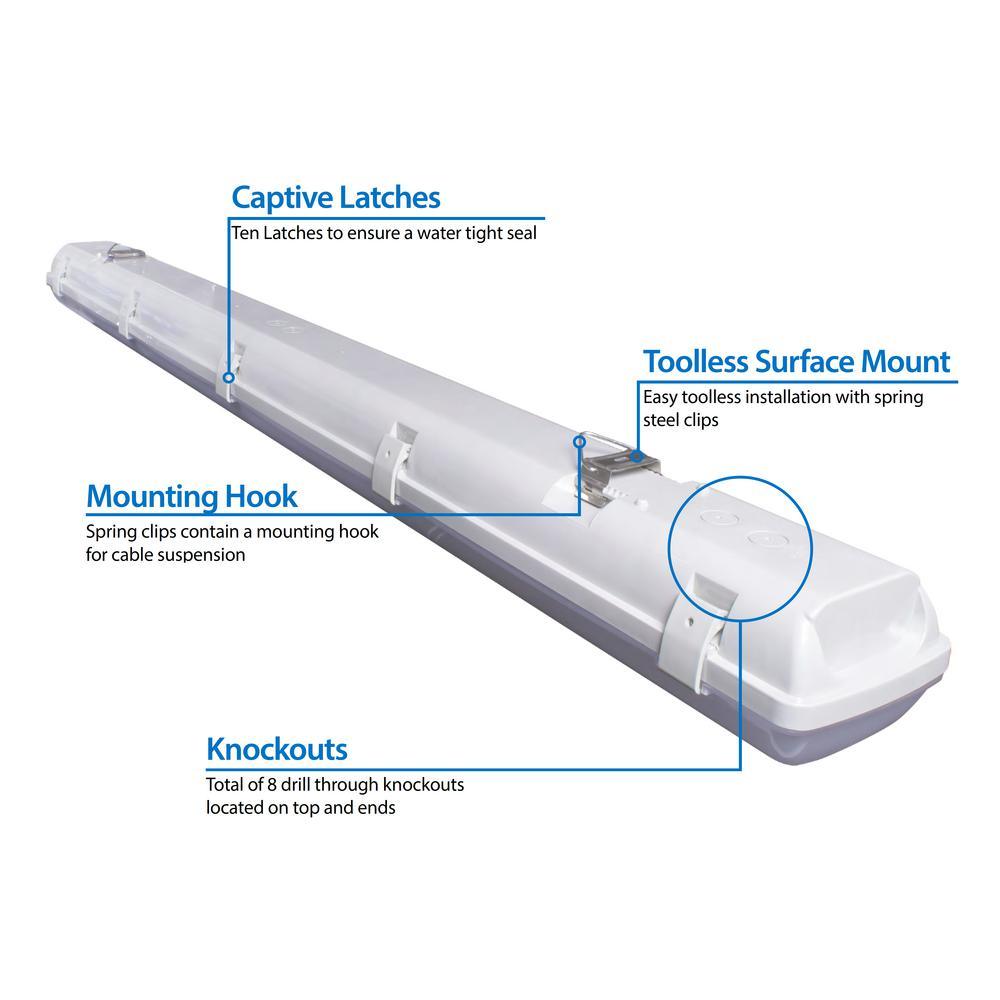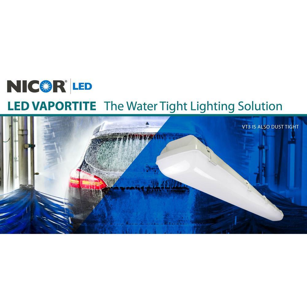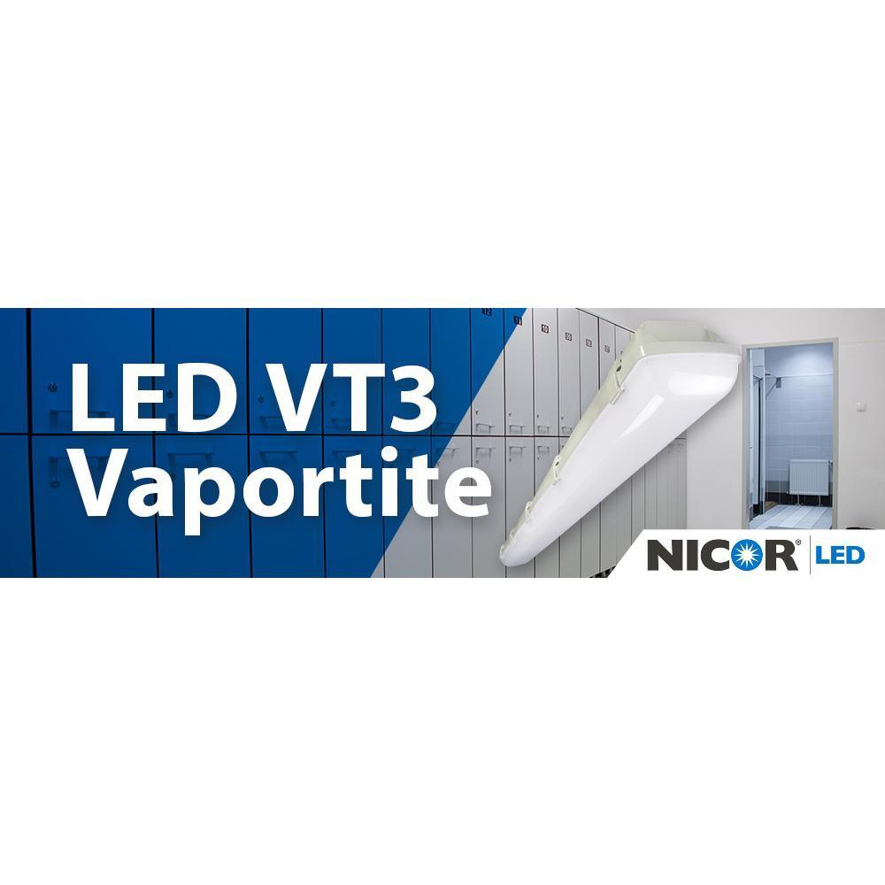 The VT3 LED 4 ft. Linear Vaportite is designed to provide long-lasting, energy efficient light in extreme locations. This IP65 rated VT3 features a UV-stabilized polycarbonate diffuser lens resistant to the most brutal outdoor conditions. The VT3 is also dust-proof and water-tight to protect the internal components while providing a long 54,000-hour life span. This 4 ft. LED Vaportite is perfect for replacing ancient fluorescent strip lights in garages, maintenance facilities, workshops and high-traffic outdoor areas that require a commercial grade durability. The VT3 is DLC Premium Listed and Protected by NICOR's 5-Year Limited Warranty.
