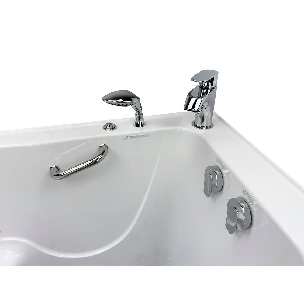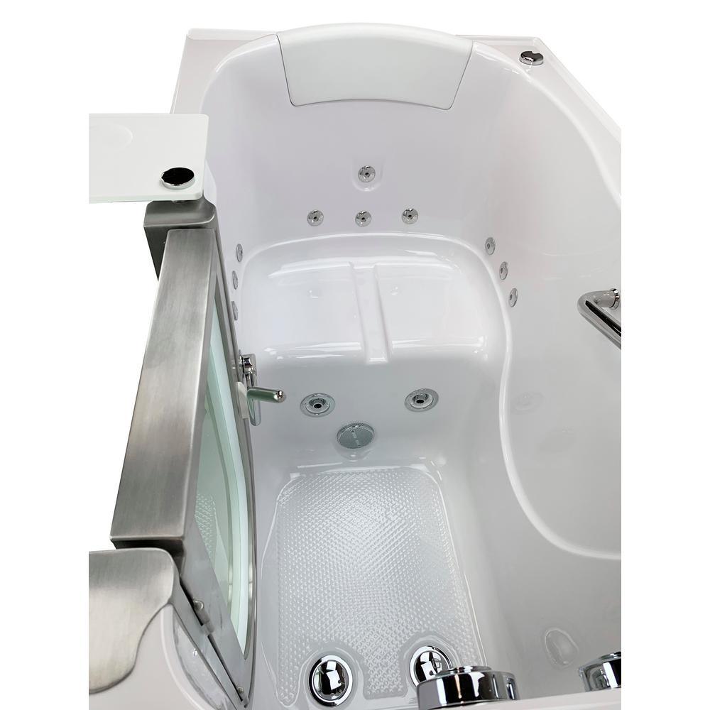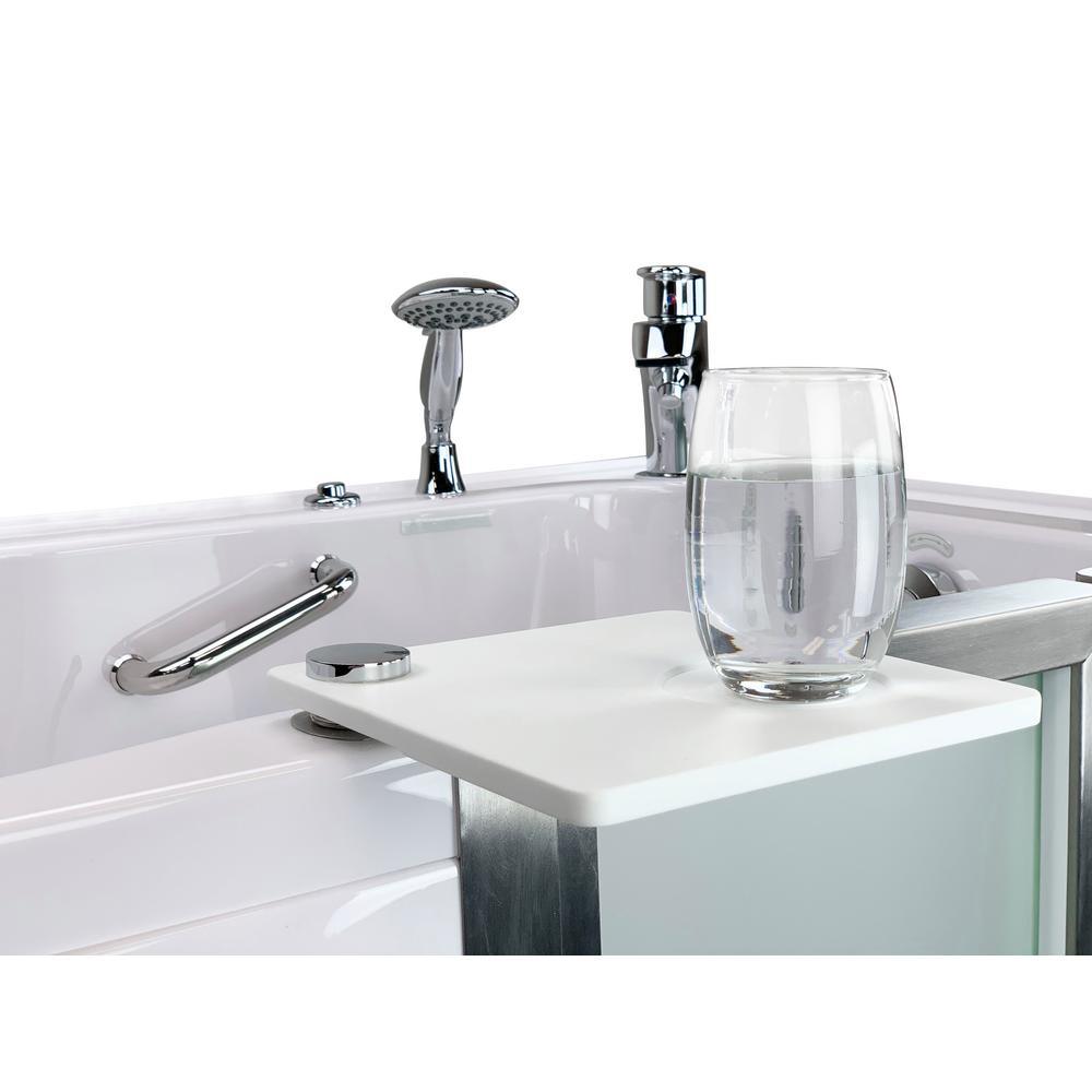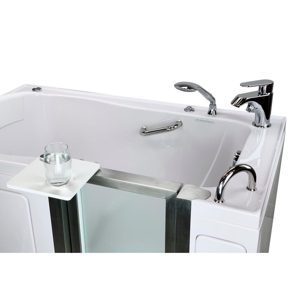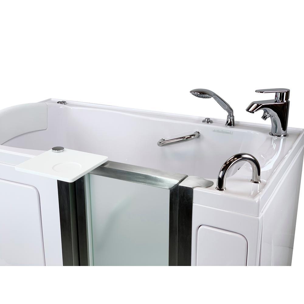 The Ella Elite 52-inch acrylic walk-in whirlpool bathtub combines a sleek stainless steel/glass inward-swing door with a glossy white shell for safe, luxurious bathing. It includes a fast-fill 2-piece faucet and Ella’s 2-inch dual drain for rapid gravity-driven emptying, plus ergonomic seating and hydro massage jets for comfort.