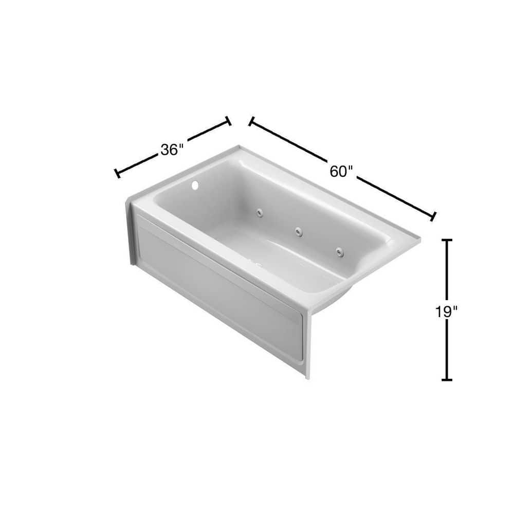 Q: Is this tub suitable for a standard alcove? A: Yes—its overall dimensions are 60 in. L x 36 in. W x 19 in. H and it’s designed for 3-wall alcove installations with a left-hand drain.