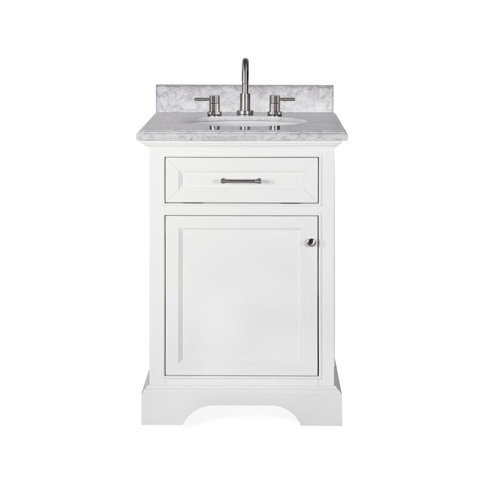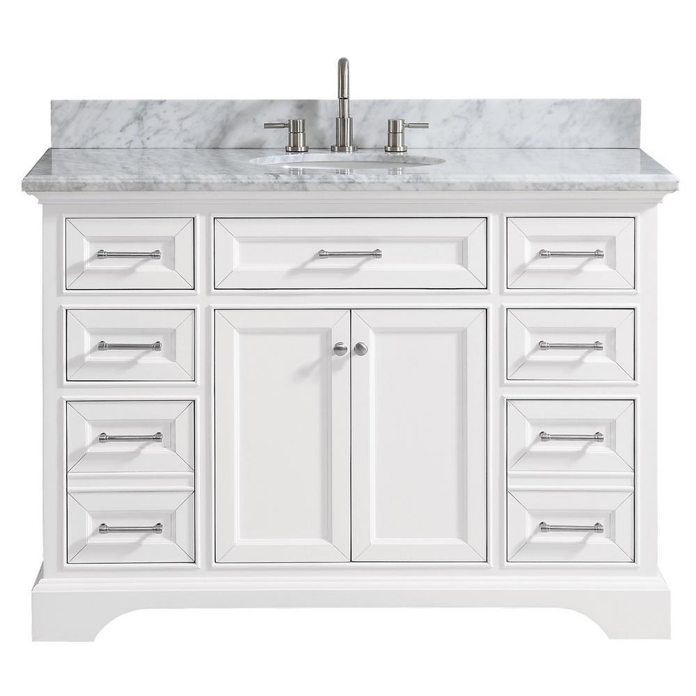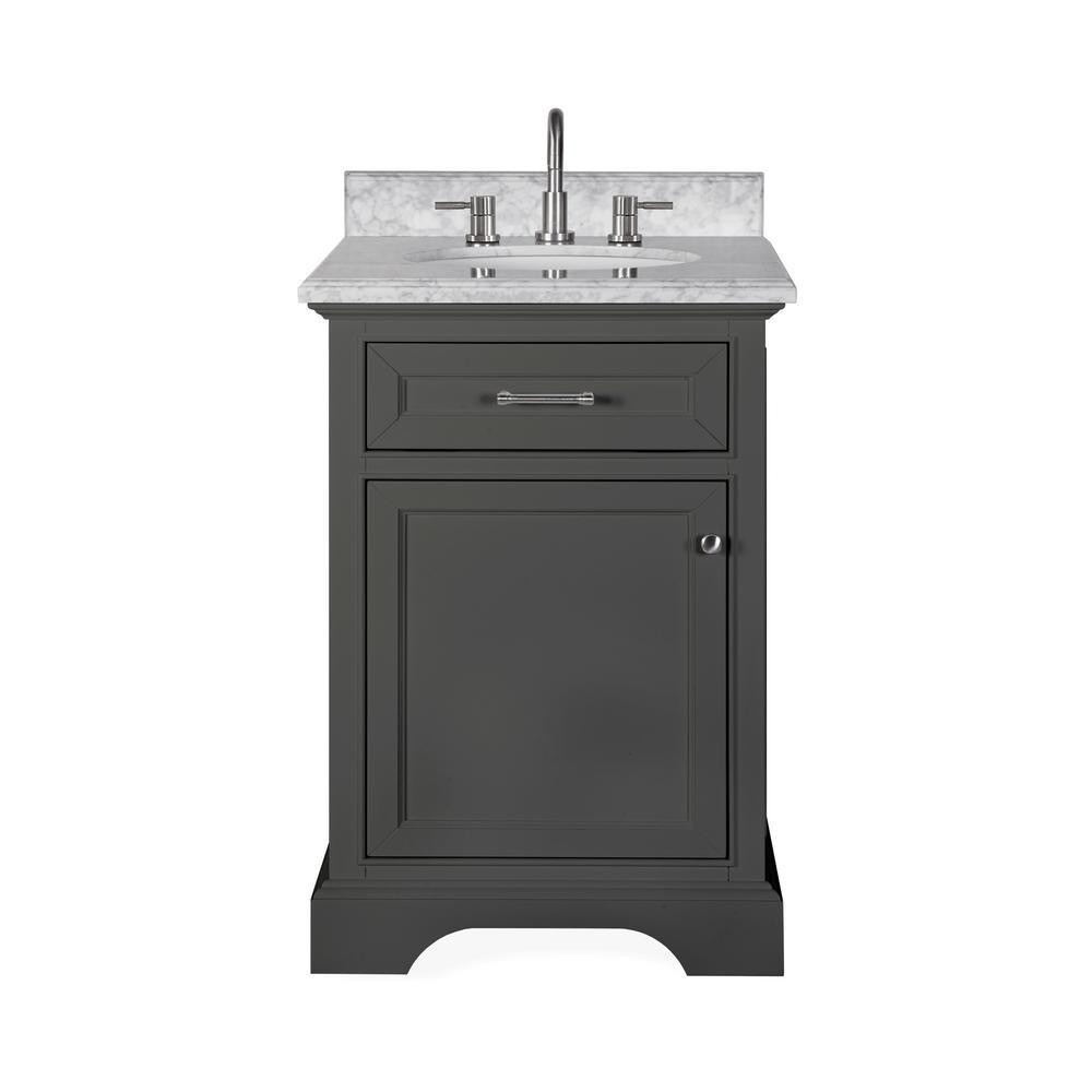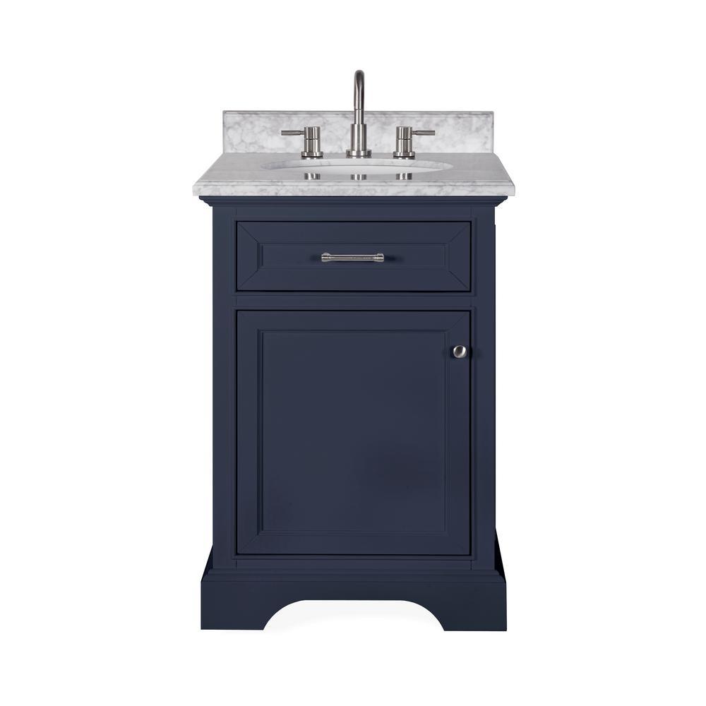 The Windlowe Collection features classical design enhanced by an elegant Navy Blue finish, creating an aesthetic that mixes flair and function. The Windlowe 37 in. vanity showcases its quality and style with a solid wood frame, brushed nickel hardware and soft-close hinges and glides. The vanity combo includes a Carrara white marble top and white vitreous China undermount oval sink.