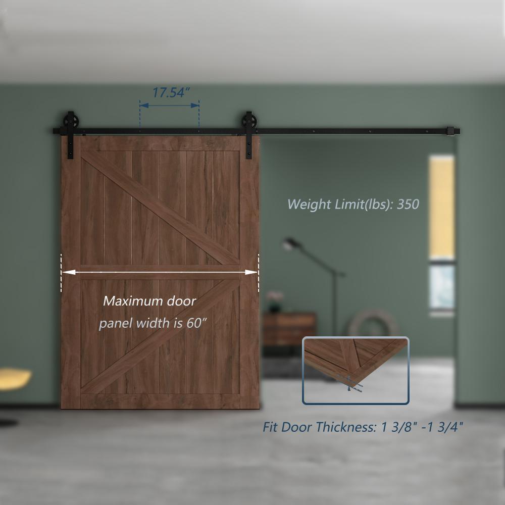 • Pre-install notice: only the hardware is for sale, doors are not included the hardware package has lag bolts for wooden wall/drywall/concrete wall our sliding barn door hardware kit is compatible with door thickness from 1-3/8 in. to 1-3/4 in. if you have a door trim, you would better put a header board that is as thick as the trim and then attach the rail to the header board you need to have at least 8 in. of space between the top of the door to the ceiling to accommodate the hardware we use 2 hangers to hold 1 door, for a single door kit, there will be 2 hangers in the package, for a double door kit, there will be 4 hangers, if you have a door that is either too wide or too heavy, then you can purchase additional hangers for that door