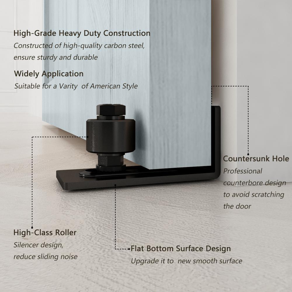 Floor guide: fit door panel thickness: 7/8 in. to 2-1/8 in., adjust the 2 rollers to fit the door panel and then tighten the screw in the bottom of the floor guide so that the rollers will be fixed in the workable position