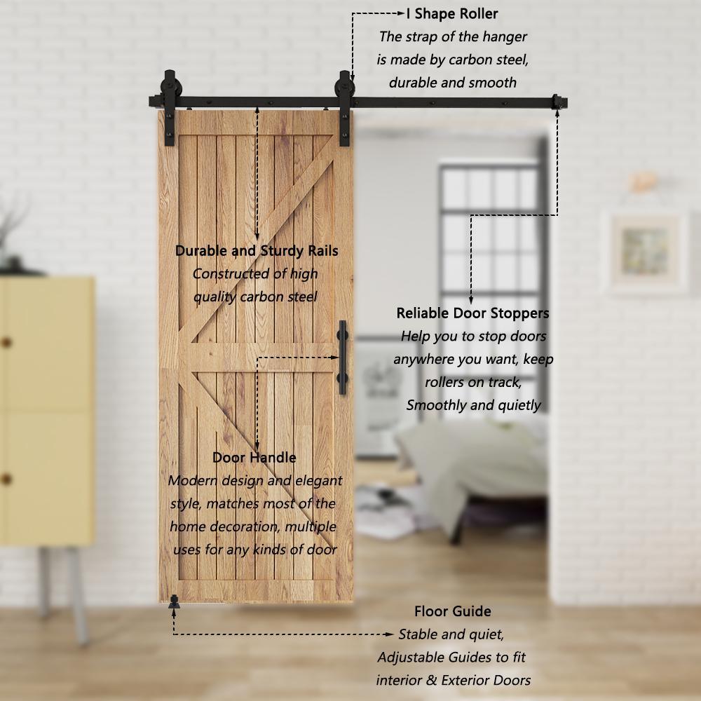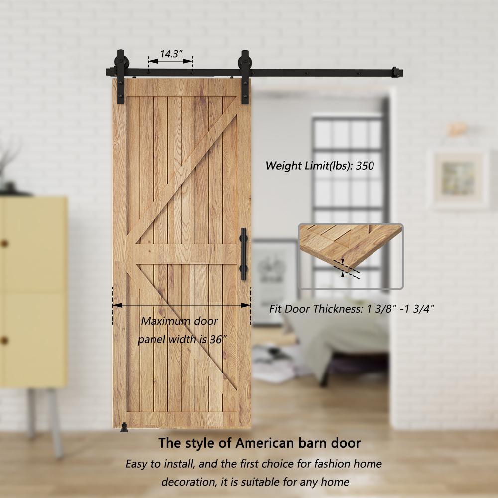 Pre-install notice: only the hardware is for sale, doors are not included, the hardware package has lag bolts for wooden wall/drywall/concrete wall, our sliding barn door hardware kit is compatible with door thickness from 1-3/8 in. to 1-3/4 in., if you have a door trim, you would better put a header board that is as thick as the trim and then attach the rail to the header board, you need to have at least 5 in. of space between the top of the door to the ceiling to accommodate the hardware, we use 2 hangers to hold 1 door, for a single door kit, there will be 2 hangers in the package, for a double door kit, there will be 4 hangers, if you have a door that is either too wide or too heavy, then you can purchase additional hangers for that door