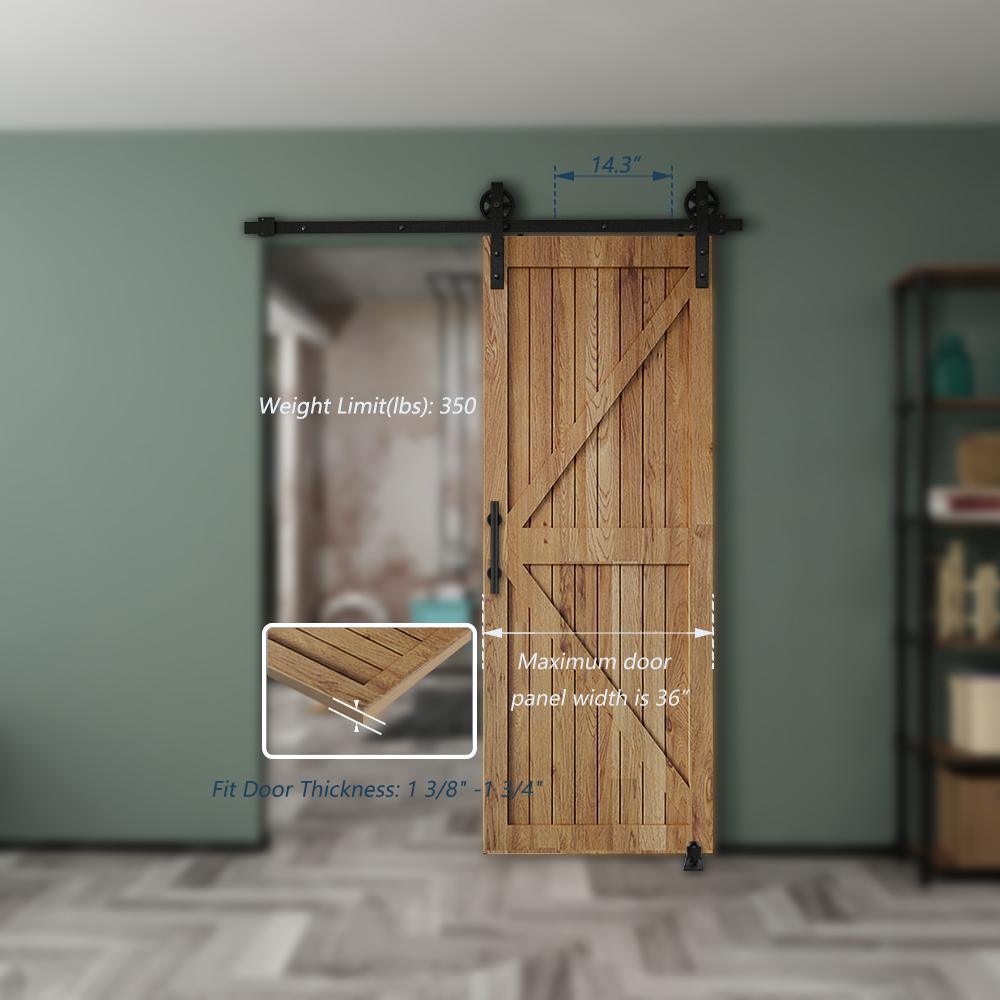 Pre-install notice: only the hardware is for sale, doors are not included, the hardware package has lag bolts for wooden wall, our sliding barn door hardware kit is compatible with door thickness from 1-3/8 in. to 1-3/4 in. if you have a door trim, you would better put a header board that is as thick as the trim and then attach the rail to the header board, you need to have at least 8 in. of space between the top of the door to the ceiling to accommodate the hardware, we use two hangers to hold one door, for a single door kit, there will be two hangers in the package, for a double door kit, there will be four hangers, if you have a door that is either too wide or too heavy, then you can purchase additional hangers for that door