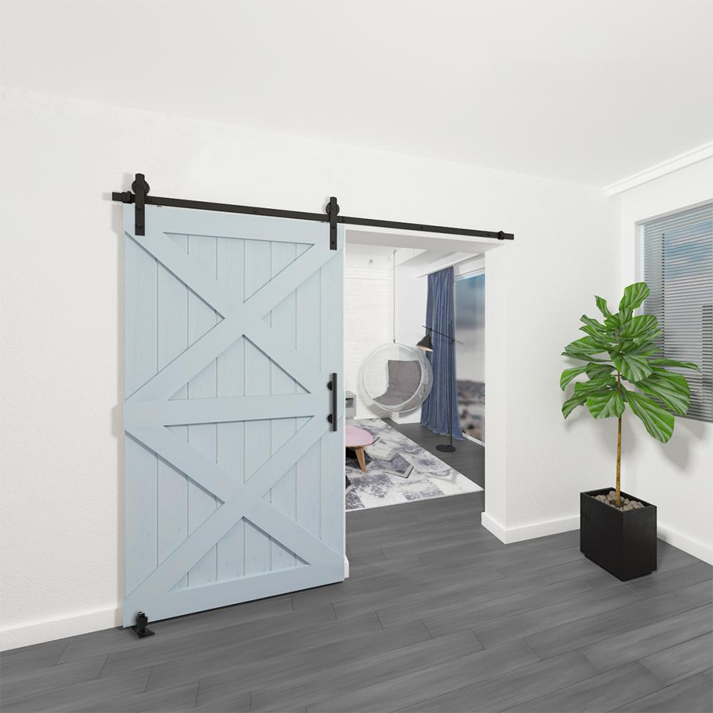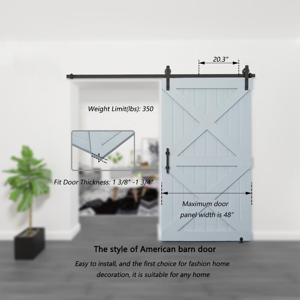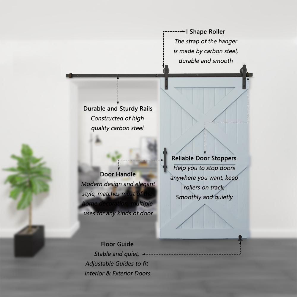 Pre-install notice: only the hardware is for sale, doors are not included, the hardware package has lag bolts for wooden wall/drywall/concrete wall, our sliding barn door hardware kit is compatible with door thickness from 1-3/8 in. to 1-3/4 in., if you have a door trim, you would better put a header board that is as thick as the trim and then attach the rail to the header board, you need to have at least 5 in. of space between the top of the door to the ceiling to accommodate the hardware, we use 2 hangers to hold 1 door, for a single door kit, there will be 2 hangers in the package, for a double door kit, there will be 4 hangers, if you have a door that is either too wide or too heavy, then you can purchase additional hangers for that door