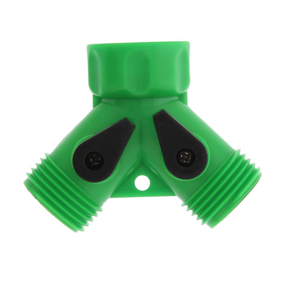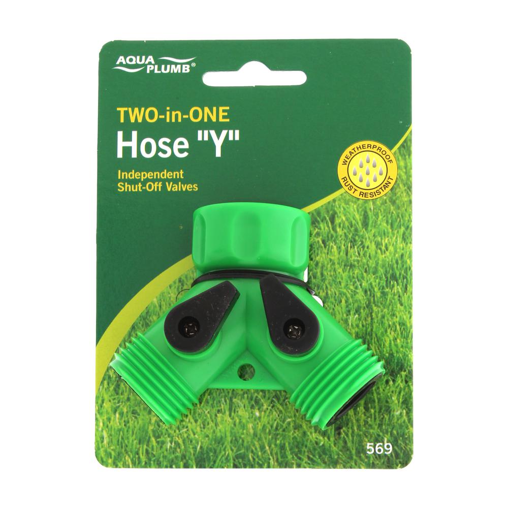 This Aqua Plumb Plastic Hose Y Dual Valve allows for 2 outlets from 1 garden hose connector. It is designed to fit the standard garden hose and is both weatherproof and rust resistant, making it suitable for use in any season. The valve is made of durable plastic material.