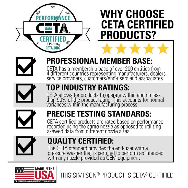 4 stainless steel quick connect nozzles (3400 psi at 2.5 GPM) and 1 soap nozzle for various cleaning tasks