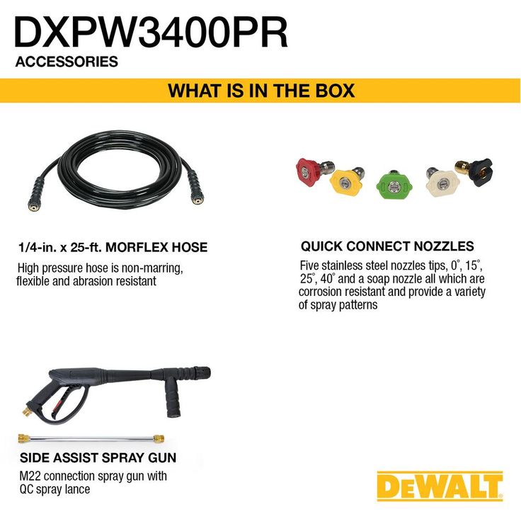 DEWALT pressure washers deliver high performance and maximum power straight from the box. The PressuReady cold water gas pressure washer comes equipped with 4 stainless steel quick connect nozzles (CETA certified 3400 psi at 2.5 GPM) and is built to perform for your professional tasks. Great for cleaning equipment, wood structures, driveways and vinyl siding. Ideal for mid to heavy portable power washing needs. DEWALT offers sturdy, reliable high pressure cleaners that are easy-to-assemble, easy to start and easy to store. They are perfect for industrial pressure washing, commercial pressure washing and residential pressure washing. **Battery sold separately