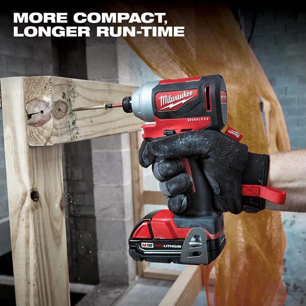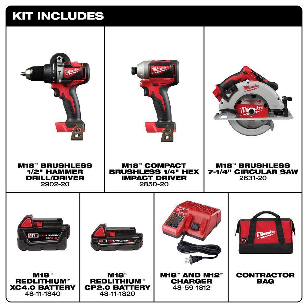 Power through drilling, fastening, and cutting with Milwaukee’s M18 brushless 3‑tool combo. The 1/2 in. hammer drill, 1/4 in. hex impact driver, and 7‑1/4 in. circular saw run on REDLITHIUM batteries with REDLINK intelligence for longer runtime and protection. Includes two batteries, charger, blade accessories, and contractor bag.