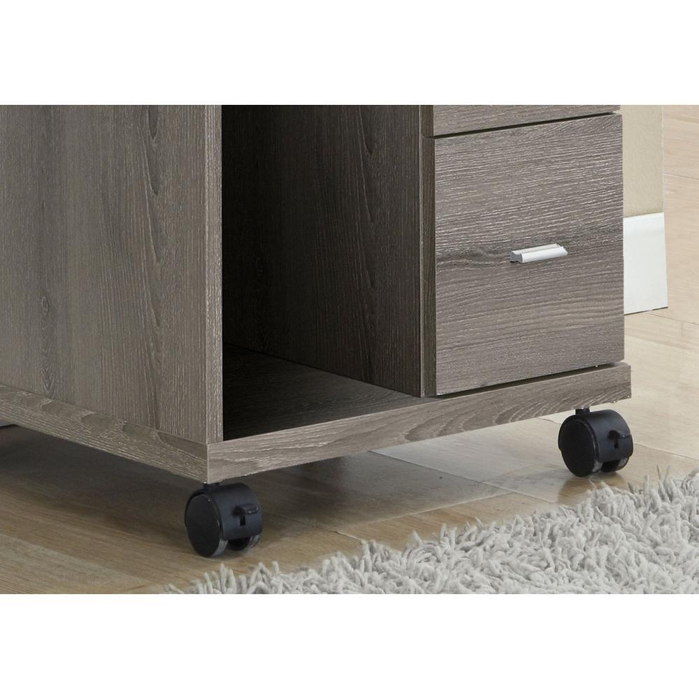 This mobile stand is the perfect combination of contemporary design and functionality. Finished in a dark taupe wood-look with sleek lines and thick panels, this cabinet will add modern appeal to any home office. It features two drawers for added storage, an open compartment for a CPU or other accessories and mounted on 4 castors for ease of mobility. An ideal place for a printer or scanner or other computer hardware. Use this printer cabinet as a stand-alone or paired with matching desk and bookshelf for optimal organization.