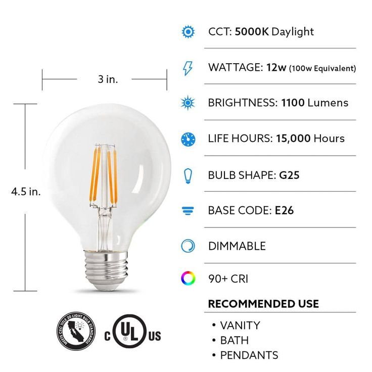 Enjoy all the benefits of advanced LED energy-saving technology with the Feit Electric BPG25100/850/FIL/LED/3 11-Watt G25 LED Light Bulb. This 5000K daylight bulb is dimmable and will replace a 100-Watt equivalent incandescent bulb. It produces a similar light output (1200 Lumens), uses 11-Watt of electricity and up to 89% less energy than a standard incandescent light bulb. Get instant on to full brightness with relatively cool running performance. Feit Electric G25 light bulbs have an average life of 15,000 hours / 13.7 years are RoHS compliant and are 100% mercury free. Choose a dependable bath and vanity bulb for residential or commercial applications.