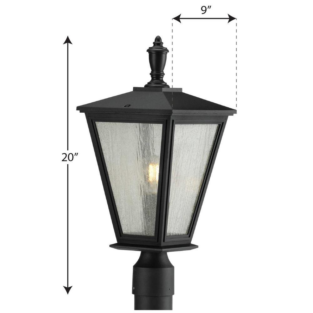 Beckon family and friends home with the coastal glow of this post lantern. Clear seeded glass panes that evoke memories of salty sea spray as a light base rests within the enclosure. The panes are housed in a timeless black frame that is corrosion-resistant for excellent longevity. DURASHIELD by Progress Lighting is built to last. Constructed from a composite material with UV protection, DURASHIELD holds up even in the harshest weather conditions. This high-performance finish has a 5-year warranty and is resistant to rust, corrosion, and fading.