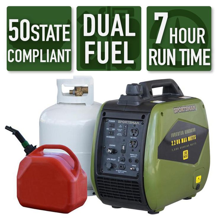 The Sportsman 2200-Watt Dual Fuel Inverter Generator has the power and flexibility to handle tasks from tailgating, camping and running electronics. Safely charge and run your phone, computer, television and more using either unleaded gasoline or propane gas. With this dual-fuel ability, use whichever is easily-accessible or more affordable. The sine wave power delivers clean, stable and reliable power making it safe for use with sensitive electronics. You won’t have to leave your tablets, computers and televisions at home. With a 50% load, the generator can run for 7-hours on a full tank of gasoline (1 Gal.) and 18-hours with a full tank of propane (the common gas grill type). It includes a 5 ft. propane fuel hose with regulator so you can get the generator up and running quickly and easily. The 3 HP engine is surprisingly quiet, running at fewer than 60 db. An economy switch on the control panel automatically reduces engine speed when loads are turned off or disconnected, saving energy and fuel. This Dual Fuel Inverter Generator also comes equipped with a parallel power port terminal that allows the user to chain 2 Sportsman generators together to increase the total output power when using a Parallel Power Kit (sold separately).