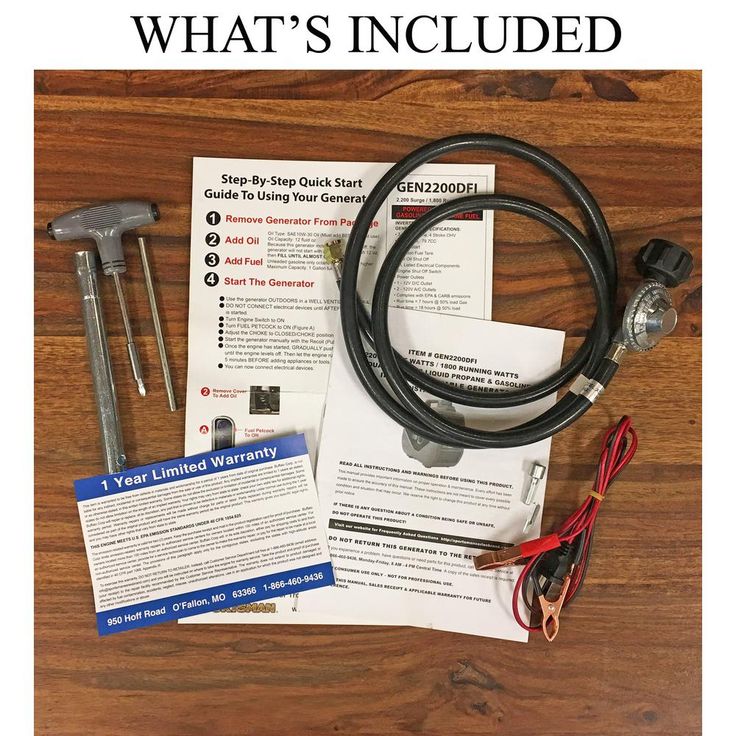 Comes with a 5 ft. regulator hose kit, set of DC connectors for charging 12-Volt automotive-type batteries, funnel for adding oil, spark plug wrench, T-type wrench, sockets and crosshead screwdriver
