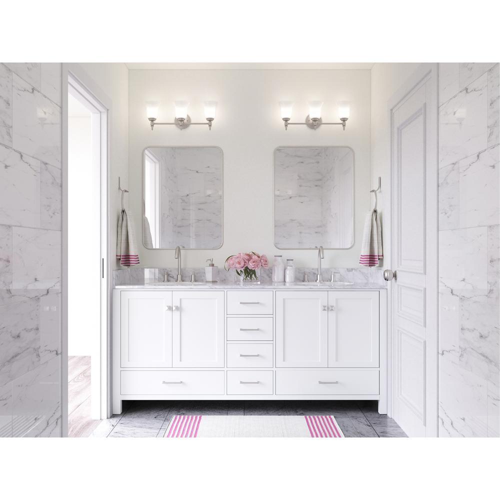 - Satin nickel finish hardware included