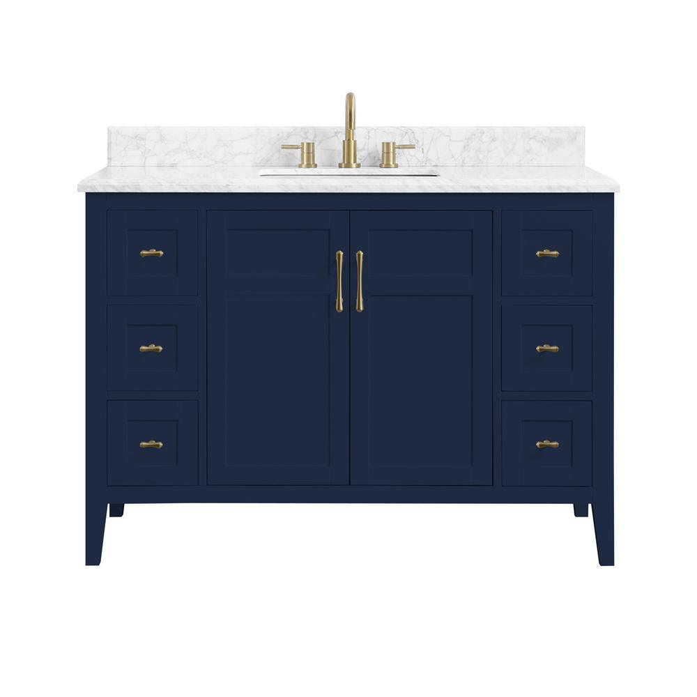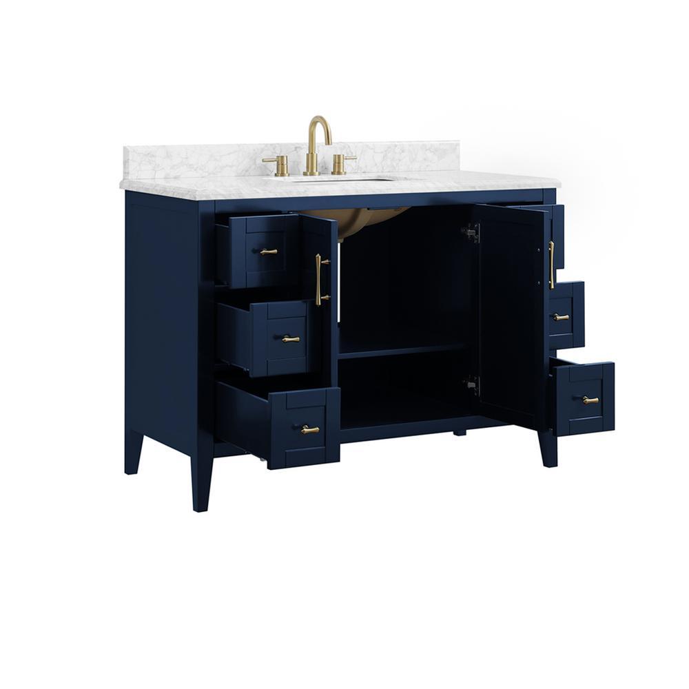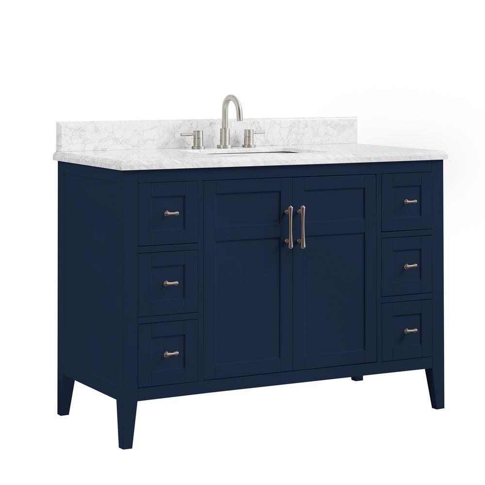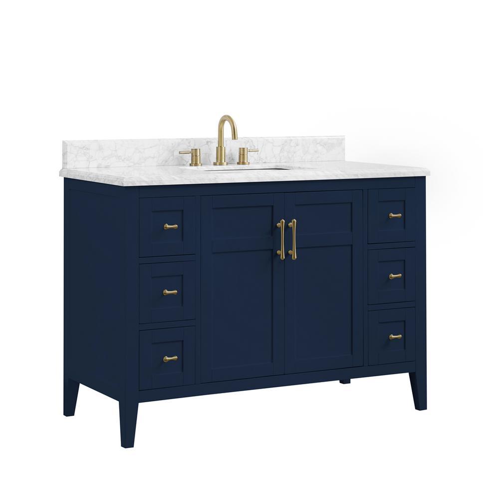 Reflect your sense of style with the Sturgess 49 in. Bath Vanity. This classic transitional vanity showcases a rich navy blue finish, shaker panels, and the option of both matte gold and brushed nickel hardware depending on your preference. A solid wood frame, corner blocking, adjustable shelf, and soft-close glides and hinges demonstrate quality construction and attention to detail. A premium Carrara white marble top and rectangular undermount sink top off this beautiful vanity set. Pair it with the matching mirror to complete the look.