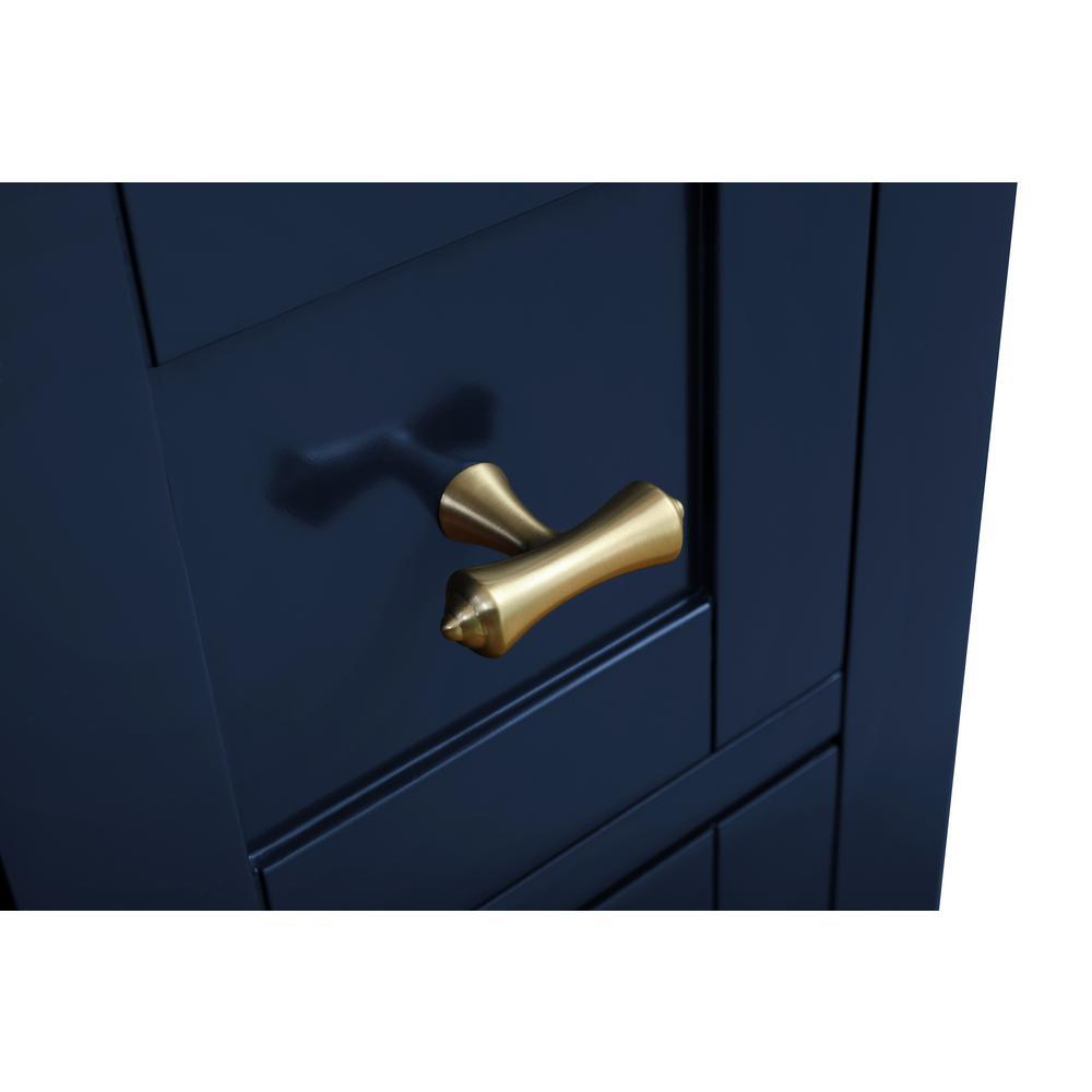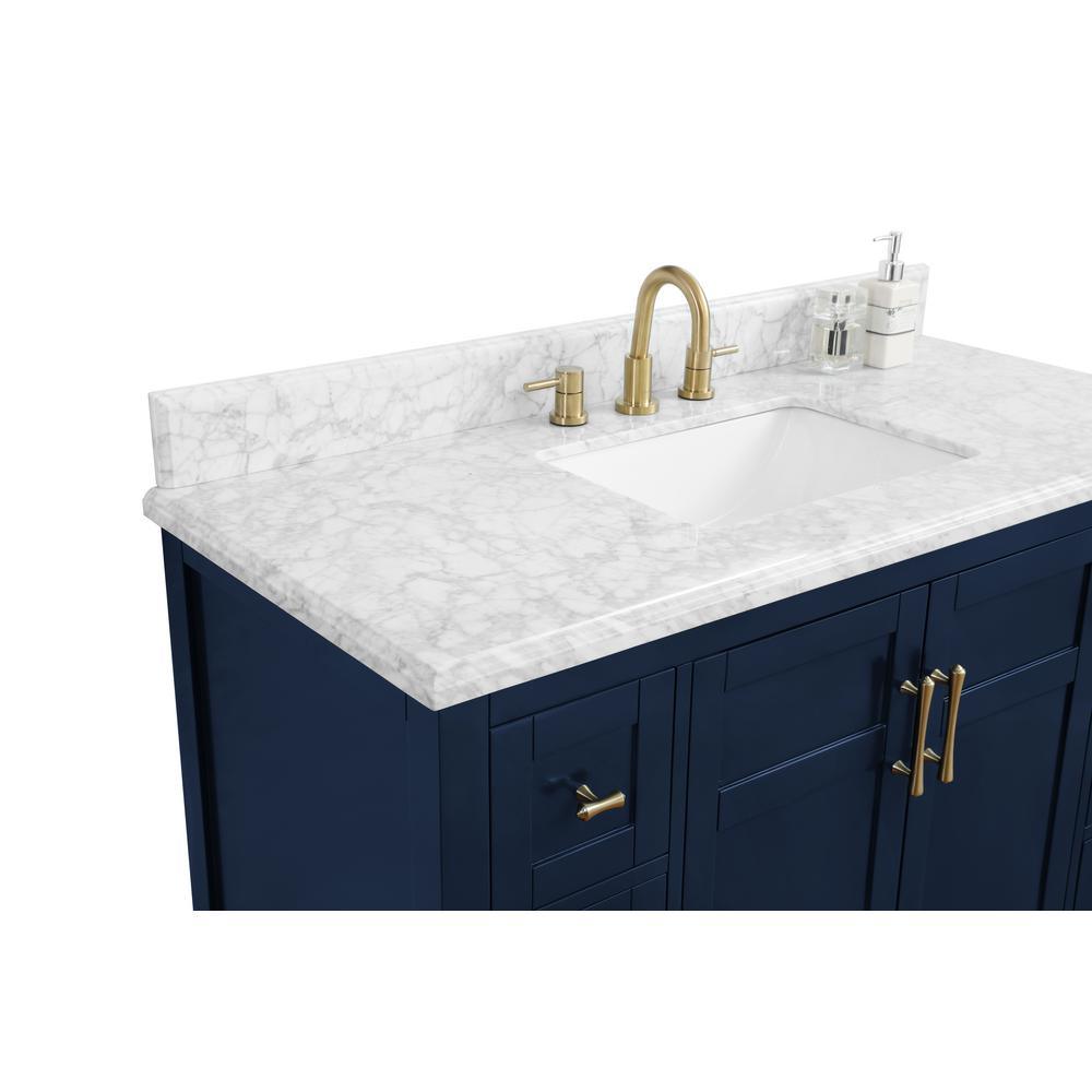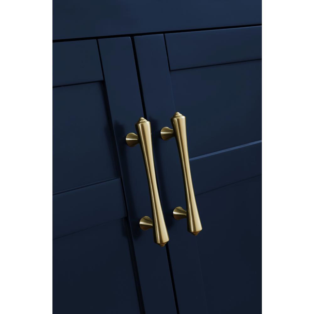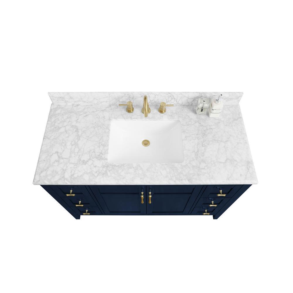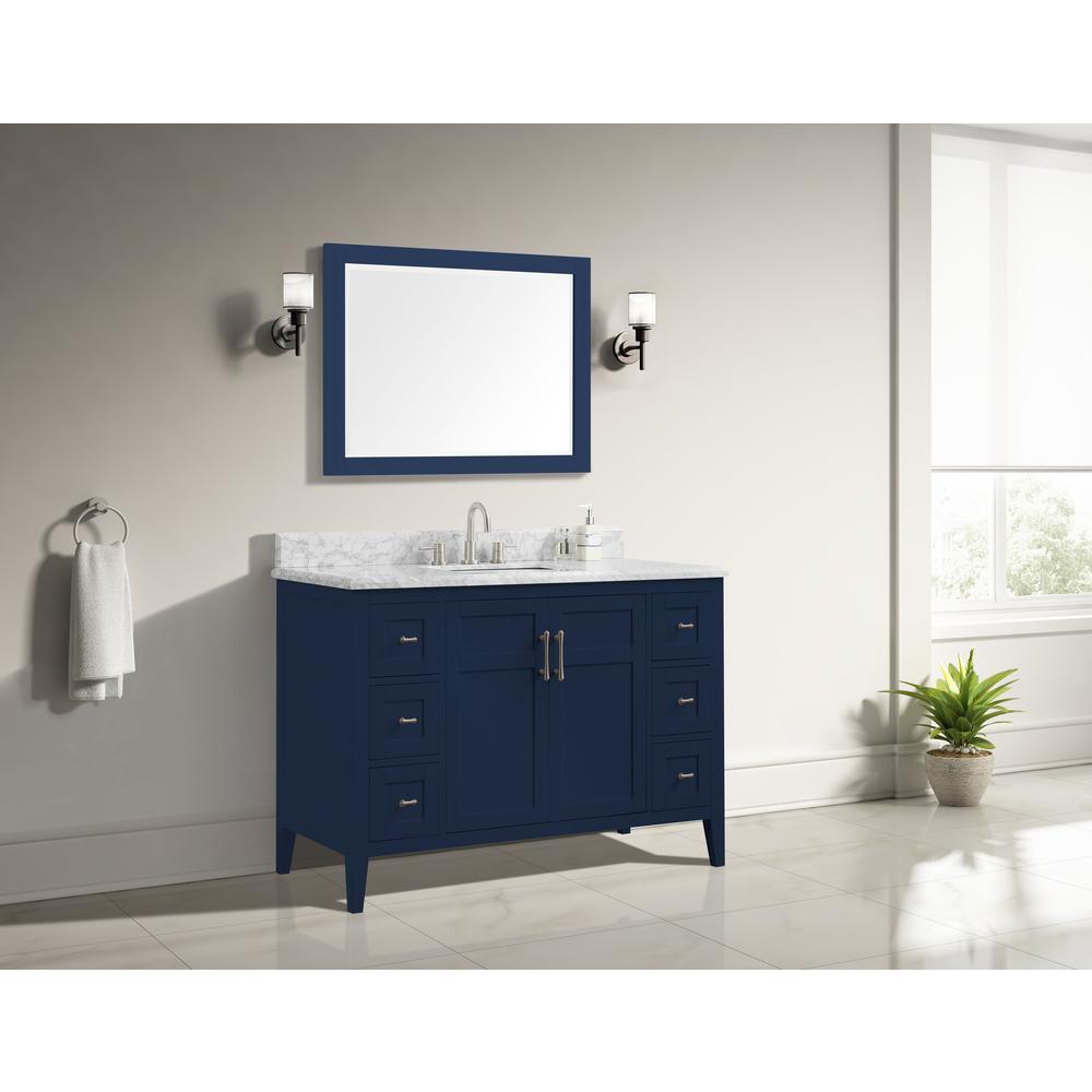 Reflect your sense of style with the Sturgess 49 in. Bath Vanity. This classic transitional vanity showcases a rich navy blue finish, shaker panels, and the option of both matte gold and brushed nickel hardware depending on your preference. A solid wood frame, corner blocking, adjustable shelf, and soft-close glides and hinges demonstrate quality construction and attention to detail. A premium Carrara white marble top and rectangular undermount sink top off this beautiful vanity set. Pair it with the matching mirror to complete the look.