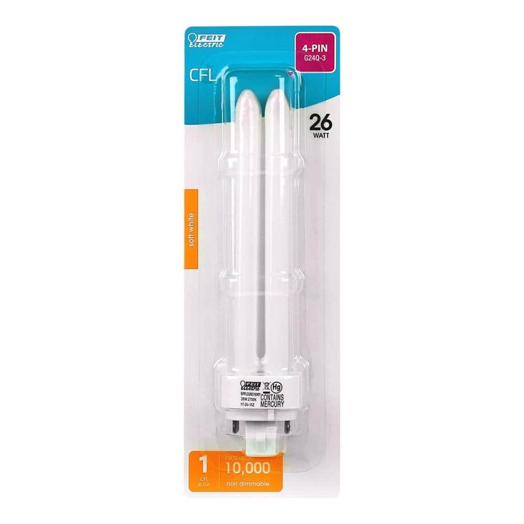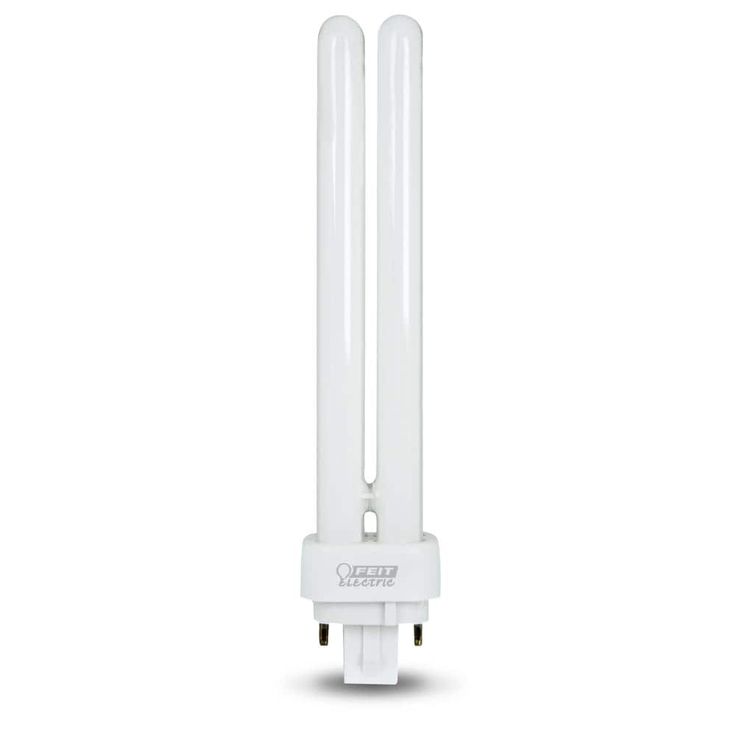 The Feit Electric BPPLD26E/HDRP 26-Watt G24Q-3 Base CFL Light Bulb in soft white (2700K) is an affordable and efficient solution for your general purpose and task lighting needs. With a light output of 1600 lumens, this PL quad tube shape bulb replaces traditional bulbs while using only 26 watts of electricity. Expect a cool running performance and an average lifespan of 10,000 hours (or 9.1 years based on 3 hours per day usage). This bulb is also compliant with RoHS and FCC regulations. Whether for residential or commercial applications, you can trust this reliable and energy-saving lighting option. It is an excellent replacement for Philips PL-C 26-Watt/827/4P/ALTO, Osram CF26DD/E/827, and GE F26DBX23/827/ECO4P. Input line voltage is 120 volts.